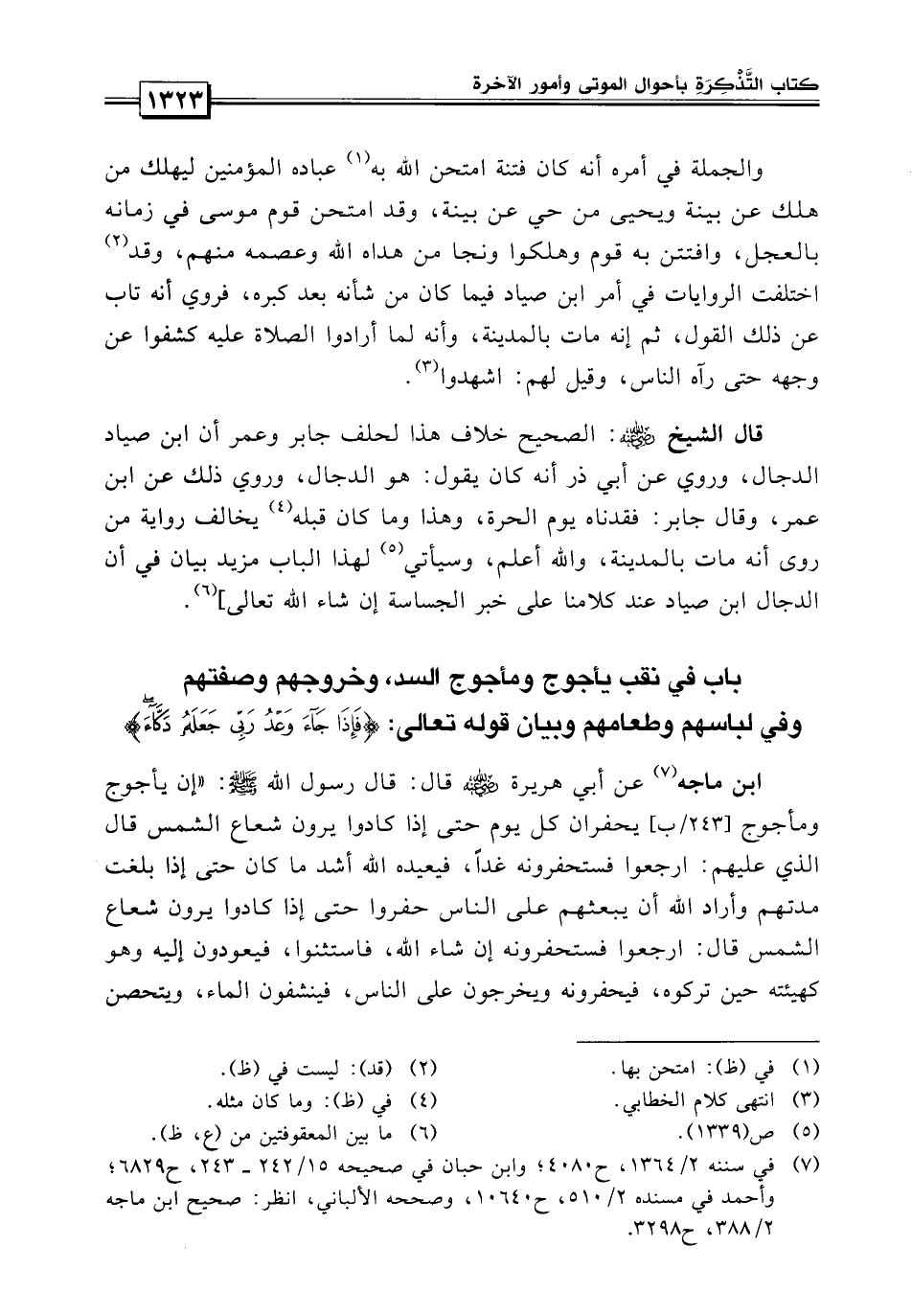 باب في ما جاء في نقب يأجوج ومأجوج السد وخروجهم وصفتهم وفي لباسهم وطعامهم وبيان قوله تعالى " فإذا جاء وعد ربي جعله دكاً "