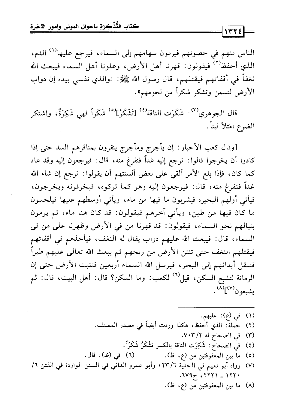 الناس منهم في حصونهم فيرمون سهامهم إلى السماء فيرجع إليها الدم، الذي أحفظ فيقولون: قهرنا أهل الأرض، وعلونا أهل السماء فيبعث الله نغفاً في أقفائهم، فيقتلون.