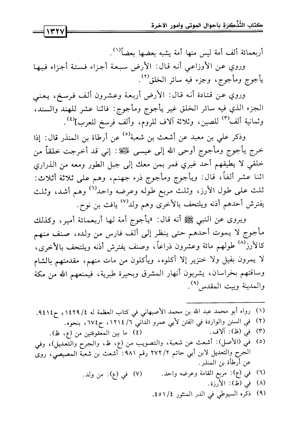 وذكر علي بن معبد، عن أشعث، عن شعبة، عن أرطأة بن المنذر قال: إذا خرج يأجوج ومأجوج أوحى الله تبارك وتعالى إلى عيسى عليه السلام أني قد أخرجت خلقاً من خلقي لا يطيقهم أحد غيري فمر بمن معك إلى جبل الطور ومعه من الذراري اثنا عشر ألفاً، قال: يأجوج ومأجوج ذرء في جهنم، وهم على ثلاث أثلاث: ثلث على طول الأرز وثلث مربع طوله وعرضه واحد وهم أشد، وثلث يفترش إحدى أذنيه ويلتحف بالأخرى، وهم من ولد يافث بن نوح.