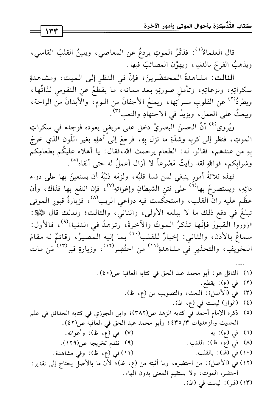 ولذلك قال عليه السلام «زوروا القبور فإنها تذكر الموت والآخرة، وتزهد في الدنيا» ، فالأول: سماع بالأذن، والثاني: إخبار للقلب بما إليه المصير، وقائم له مقام التخويف والتحذير في مشاهدة من احتضر، وزيارة قبر من مات