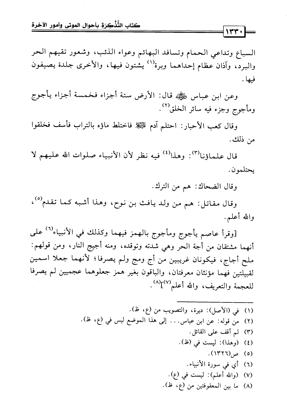 وعن ابن عباس رضي الله عنه قال: الأرض ستة أجزاء فخمسة أجزاء يأجوج ومأجوج، وجزء فيه سائر الخلق.