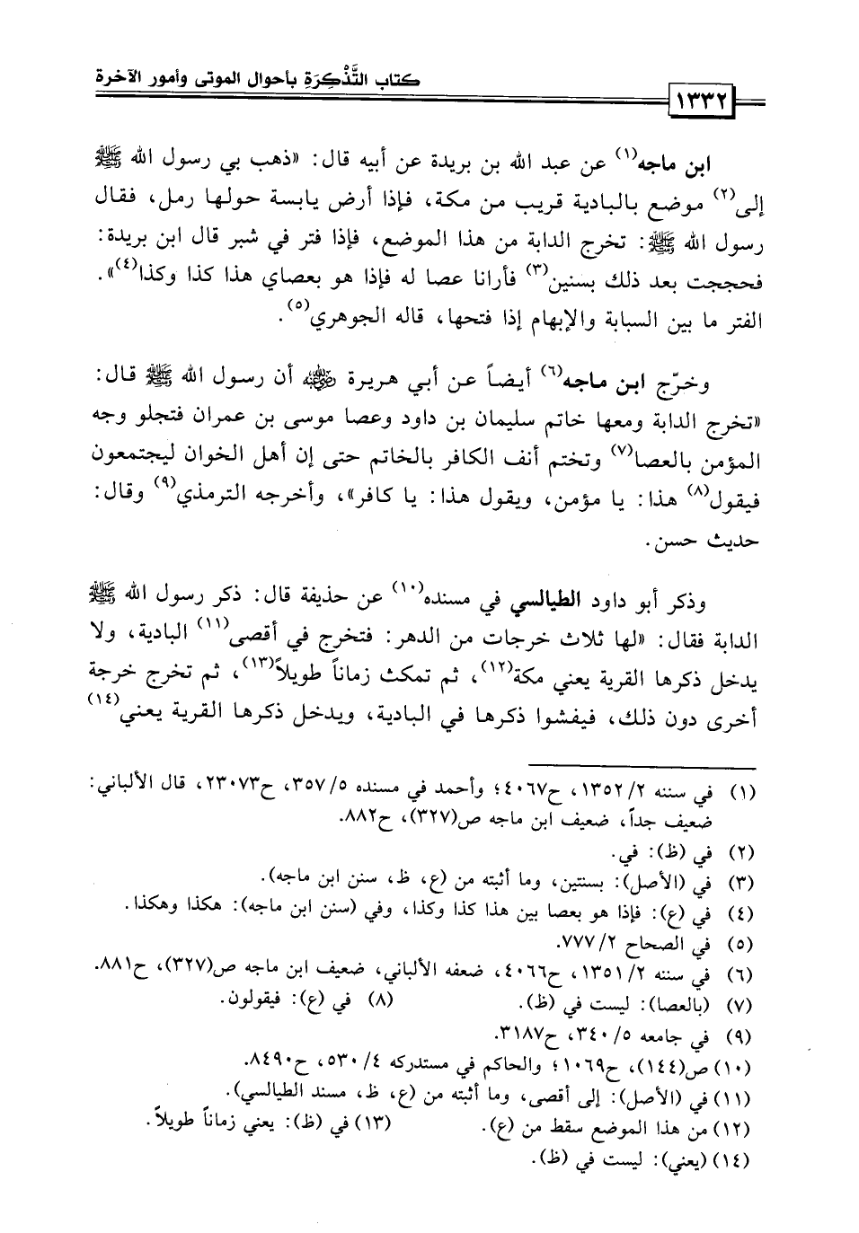 وذكر أبو داود الطيالسي في مسنده «عن حذيفة قال ذكر رسول الله صلى الله عليه وسلم الدابة فقال: لها ثلاث خرجات من الدهر: فتخرج في أقصى البادية ولا يدخل ذكرها القرية مكة، ثم تكمن زماناً طويلاً، ثم تخرج خرجة أخرى دون ذلك فيفشو ذكرها في البادية ويدخل ذكرها القرية يعني