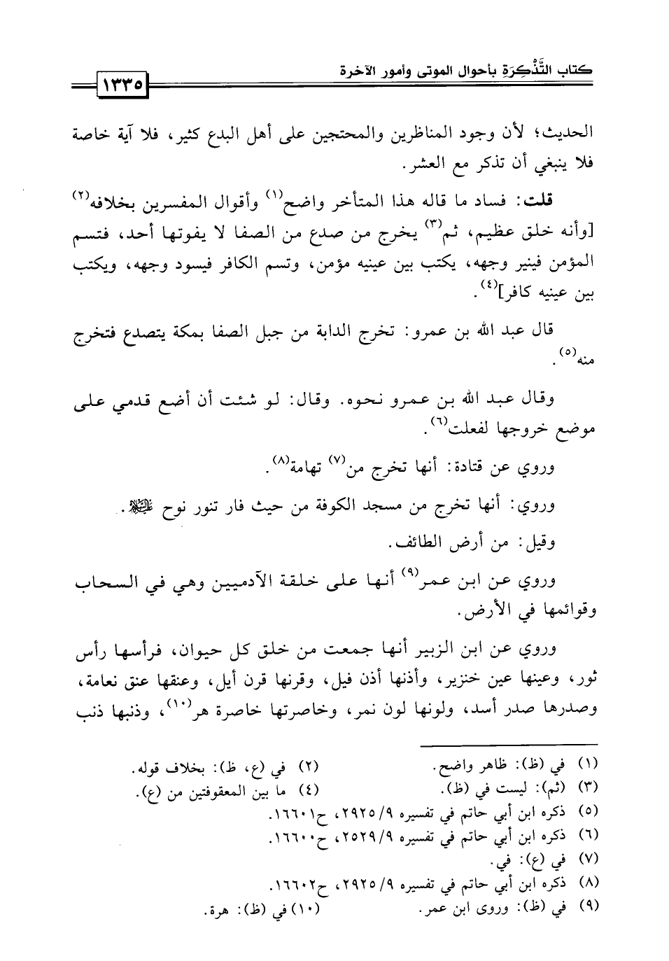 وعن عمرو بن العاص قال: تخرج الدابة من مكة من شجرة وذلك في أيام الحج فيبلغ رأسها السحاب وما خرجت رجلاها بعد من التراب ذكره القتبي في عيون الأخبار له.