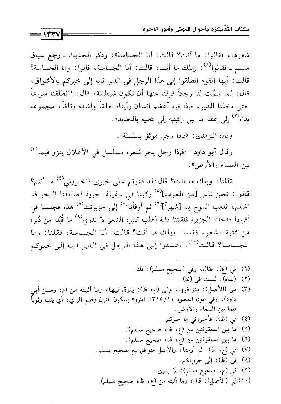 قالوا وما الجساسة؟ قالت: أيها القوم انطلقوا إلى هذا الرجل في الدير فإنه إلى خبركم بالأشواق.