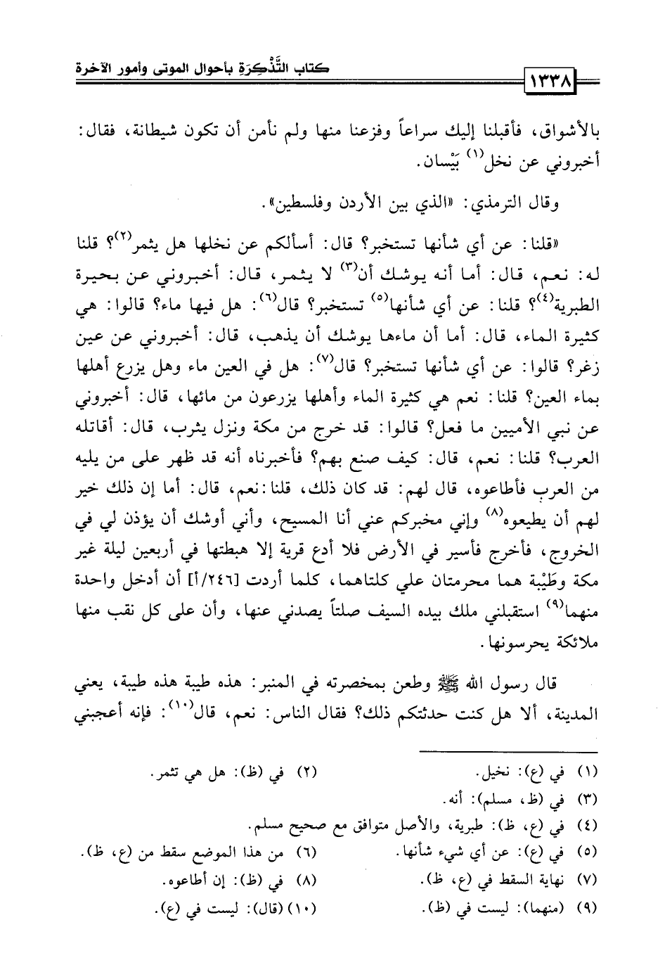 قلنا: عن أي شأنها تستخبر؟ قال: هل فيها ماء؟ قالوا: هي كثيرة الماء أما أن ماؤها يوشك أن يذهب.