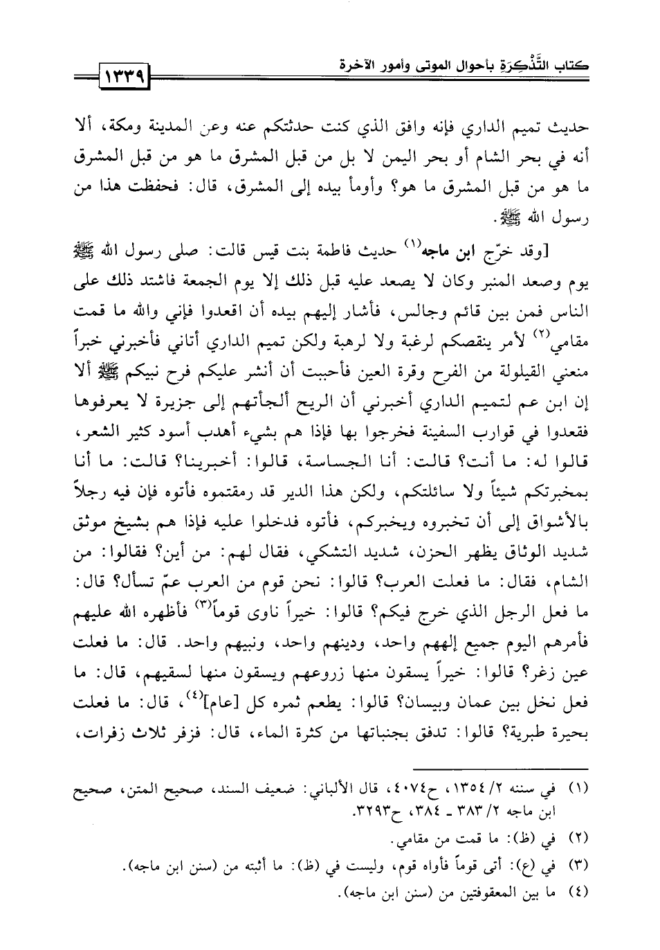 وقد خرج ابن ماجه «حديث فاطمة بنت قيس: قالت قام رسول الله صلى الله عليه وسلم ذات يوم وصعد المنبر وكان لا يصعد عليه مثل ذلك اليوم إلا يوم الجمعة، فاشتد ذلك على الناس فمن بين قائم وجالس فأشار إليهم بيده أن اقعدوا، فو الله ما قمت مقامي إلا لأمر ينفعكم لا رغبة ولا رهبة، ولكن تميم الداري أتاني فأخبرني خبراً منعني القيلولة من الفرح وقرة العين، فأحببت أن أنشر عليكم فرح نبيكم صلى الله عليه وسلم إلا أن ابن عم لتميم الداري أخبرني أن الريح ألجأتهم إلى جزيرة لا يعرفونها، فقعدوا في قوارب السفينة فخرجوا بها فإذا هم بشيء أهدب أسود كثير الشعر.
