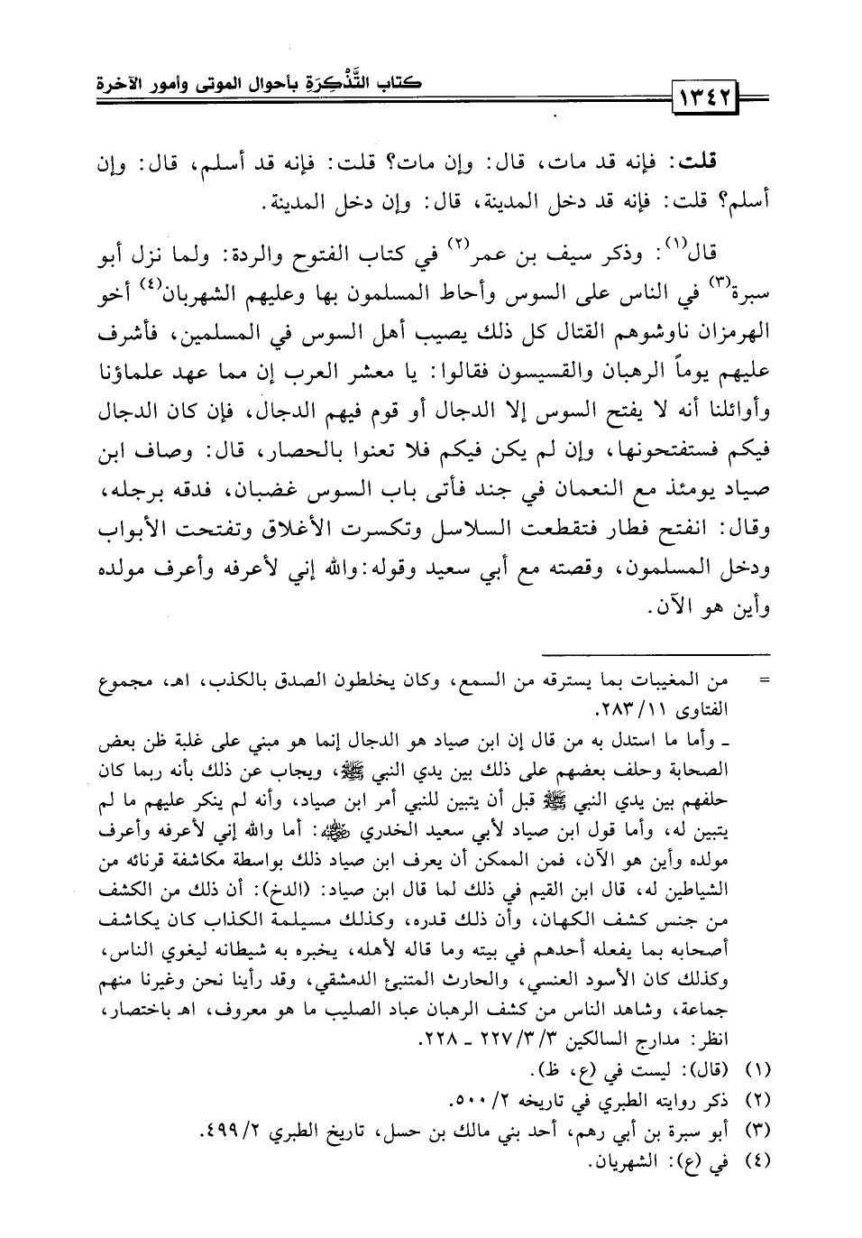 قال وصاف ابن صياد يومئذ مع النعمان في جند فأتى باب السوس غضبان فدقه برجله وقال: انفتح فطار فتقطعت السلاسل وتكسرت الأغلاق وتفتحت الأبواب ودخل المسلمون، وقصته مع أبي سعيد، وقوله: والله إني لأعرفه وأعرف مولده وأين هو الآن.