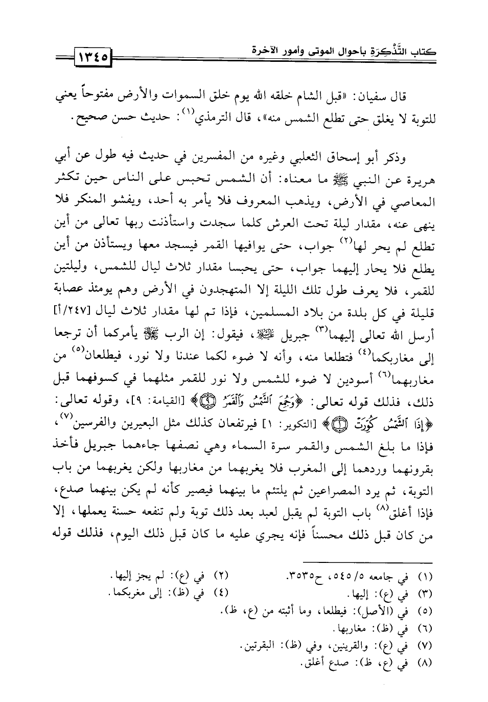 وذكر أبو إسحاق الثعلبي وغيره من المفسرين في حديث فيه طول، «عن أبي هريرة عن النبي صلى الله عليه وسلم ما معناه: أن الشمس تحبس على الناس حتى تكثر المعاصي في الأرض ويذهب المعروف فلا يأمر به أحد، ويفشو المنكر فلا ينهى عنه أحد مقدار ليلة تحت العرش كلما سجدت واستأذنت ربها عز وجل من أين تطلع لم يحر إليها جواب، حتى يوافيها القمر فيسجد معها ويستأذن من أين يطلع فلا يجر إليه جواب، حتى يجلسا مقدار ثلاث ليالي للشمس وليلتين للقمر، فلا يعرف ما طول تلك الليلة إلا المتهجدون في الأرض، وهم يومئذ عصابة قليلة في كل بلدة من بلاد المسلمين، فإذا تم لهما مقدار ثلاث ليال أرسل الله تعالى إليهما جبريل عليه السلام، فيقول: إن الرب سبحانه وتعالى يأمركما أن ترجعا إلى مغاربكما فتطلعا منه، وأنه لا ضوء لكما عندنا ولا نور فيطلعان من مغاربهما أسودين لا ضوء للشمس ولا نور للقمر مثلهما في كسوفهما قبل ذلك، فذلك قوله تعالى {وجمع الشمس والقمر} وقوله {إذا الشمس كورت} فيرتفعان كذلك مثل البعيرين والفرسين، فإذا ما بلغ الشمس والقمر سرة السماء وهي نصفها جاءهما جبريل فأخذ بقرونها وردهما إلى المغرب فلا يغربهما من مغاربهما، ولكن يغربهما من باب التوبة، ثم يرد المصراعين ثم يلتئم بينهما فيصير كأنه لم يكن بينهما صدع، فإذا أغلق باب التوبة لم يقبل لعبد بعد ذلك توبة ولم تنفعه حسنة يعملها من كان قبل ذلك محسناً، فإنه يجري عليه ما كان عليه قبل ذلك اليوم، فذلك قوله