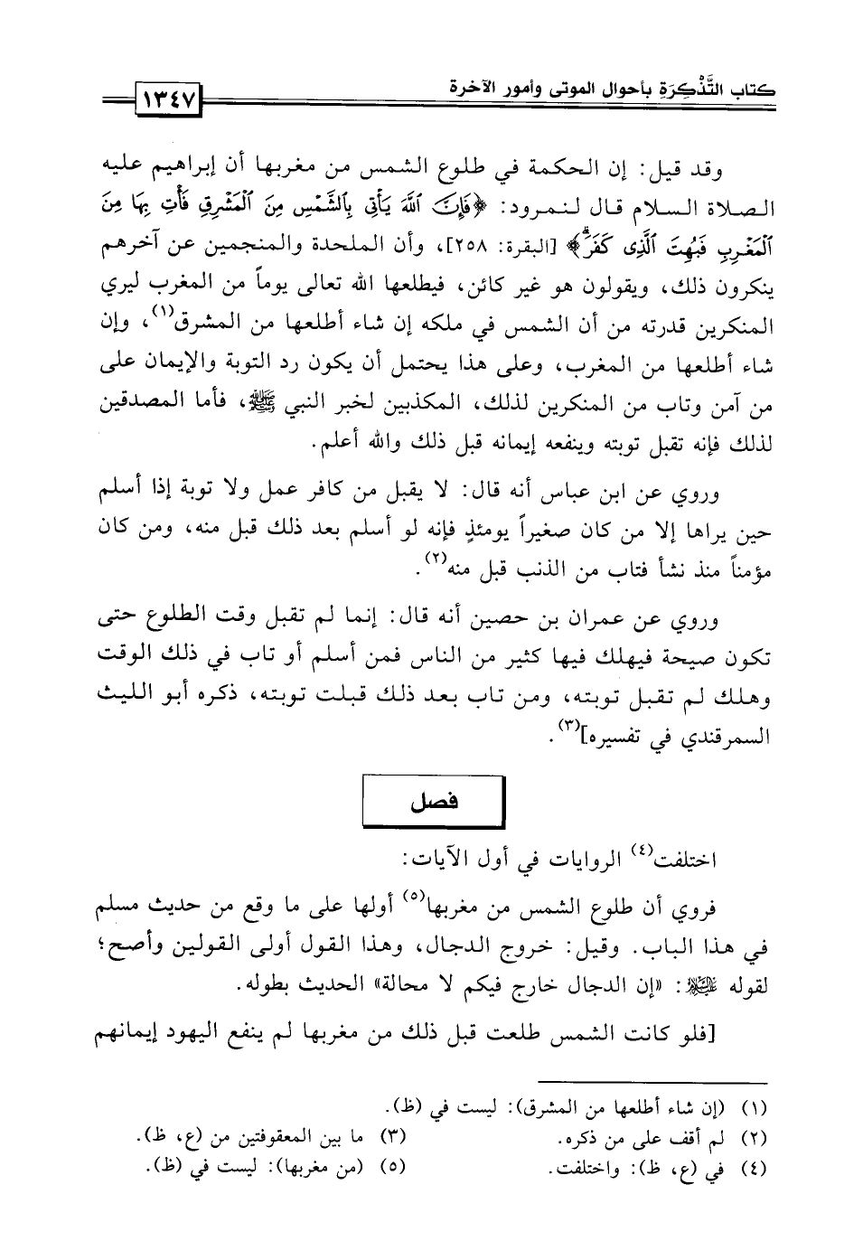 وقد قيل: إن الحكمة في طلوع الشمس من مغربها أن إبراهيم عليه السلام قال لنمرود: {فإن الله يأتي بالشمس من المشرق فأت بها من المغرب فبهت الذي كفر} وإن الملحدين والمنجمين عن آخرهم ينكرون ذلك ويقولون: هو غير كائن فيطلعها الله تعالى يوماً من المغرب ليرى المنكرين لذلك قدرته من أن الشمس في قدرته إن شاء أطلعها من المشرق وإن شاء أطلعها من المغرب، وعلى هذا يحتمل أن يكون رد التوبة والإيمان على من آمن وتاب من المنكرين لذلك المكذبين لخبر النبي صلى الله عليه وسلم، فأما المصدق فإنه تقبل توبته وينفعه إيمانه قبل ذلك، والله أعلم.
