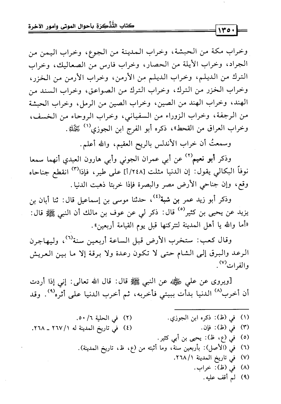 وخراب مكة من الحبشة، وخراب المدينة من الجوع، وخراب اليمن من الجراد، وخراب الأيلة من الحصار، وخراب فارس من الصعاليك، وخراب الترك من الديلم، وخراب الديلم من الأرمن، وخراب الأرمن من الخزر، وخراب الخزر من الترك، وخراب الترك من الصواعق وخراب السند من الهند، وخراب الهند من الصين، وخراب الصين من الرمل، وخراب الحبشة من الرجفة، وخراب الزوراء من السفياني، وخراب الروحاء من الخسف، وخراب العراق من القحط» .