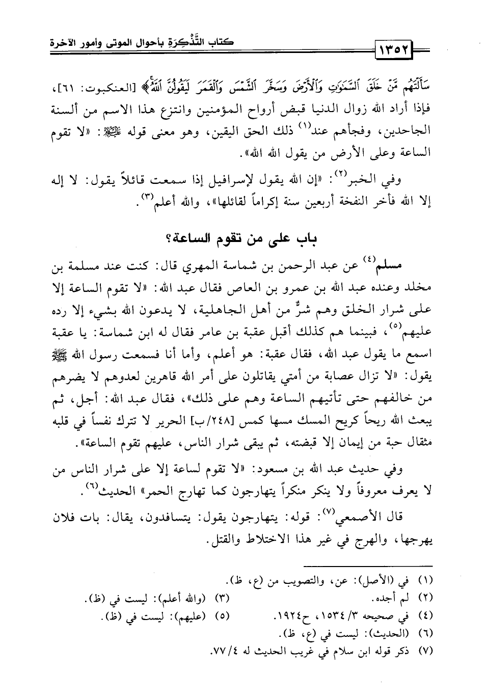 مسلم «عن عبد الرحمن بن شماسة المهدي قال: كنت عند مسلمة بن مخلد وعنده عبد الله بن عمرو بن العاص، فقال عبد الله: لا تقوم الساعة إلا على شرار الخلق وهم شر من أهل الجاهلية لا يدعون الله بشيء إلا رده عليهم، فبينما هم كذلك أقبل عقبة بن عامر فقال له ابن شماسة يا عقبة: اسمع ما يقول عبد الله، فقال عقبة: هو أعلم، وأما أنا فسمعت رسول الله صلى الله عليه وسلم يقول: لا تزال عصابة من أمتي يقاتلون على أمر الله قاهرين لعدوهم لا يضرهم من خالفهم حتى تأتيهم الساعة وهم على ذلك فقال عبد الله: أجل.