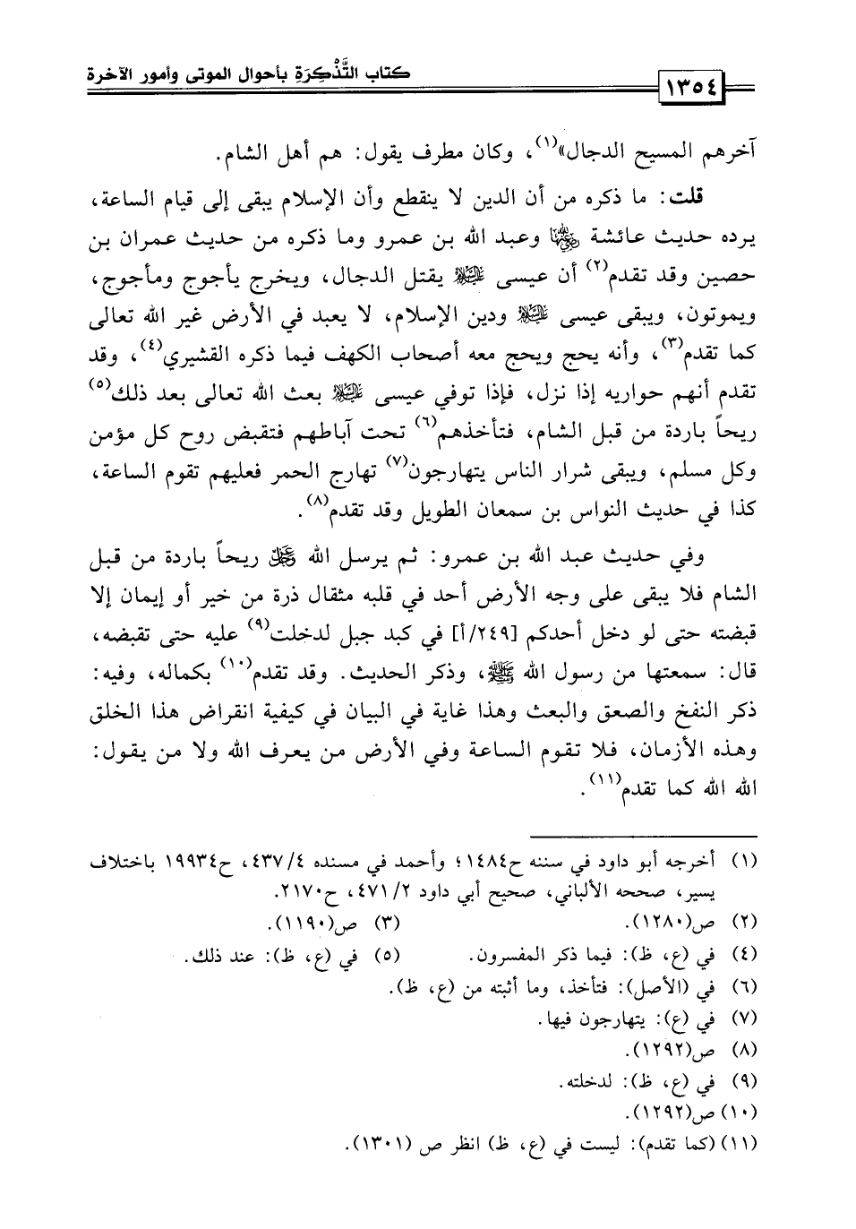 قلت: ما ذكره من أن الدين لا ينقطع وأن الإسلام يبقى إلى قيام الساعة يرده حديث عائشة وعبد الله بن عمرو، وما ذكره من حديث عمران بن حصين وقد تقدم أن عيسى عليه السلام يقتل الدجال ويخرج يأجوج ومأجوج ويموتون ويبقى عيسى عليه السلام ودين الإسلام لا يعبد في الأرض غير الله كما تقدم، وأنه يحج ويحج معه أصحاب الكهف فيما ذكره المفسرون، وقد تقدم أنهم حوارية إذا نزل فإذا توفي عيسى عليه السلام بعث الله تعالى عند ذلك ريحاً باردة من قبل الشام، فتأخذ تحت آباطهم فتقبض روح كل مؤمن وكل مسلم، ويبقى شرار الناس يتهارجون فيها تهارج الحمر فعليهم تقوم الساعة كذا في حديث النواس بن سمعان الطويل، وقد تقدم.