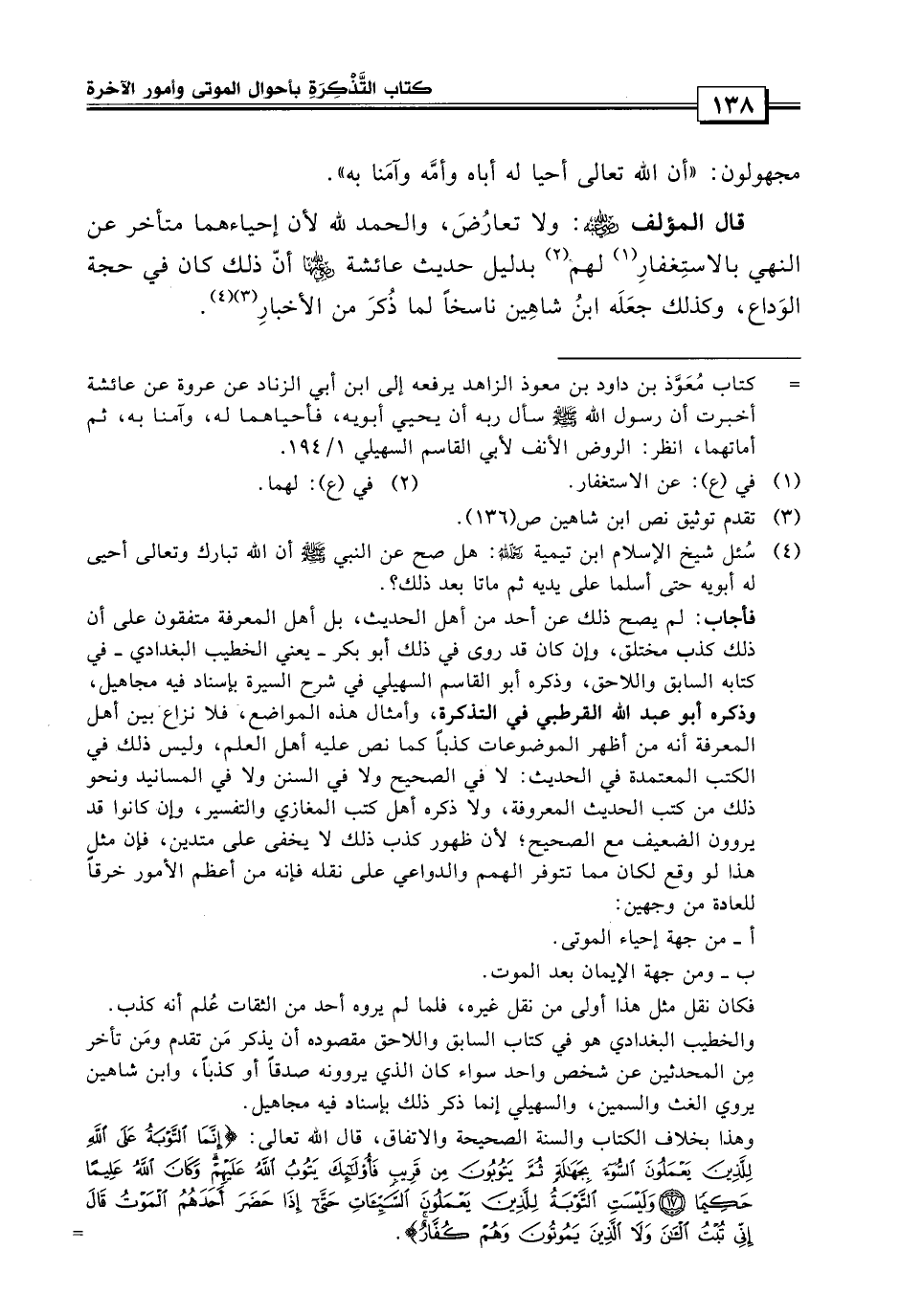 قال الشيخ المؤلف رحمه الله: ولا تعارض والحمد لله، لأن إحياءهما متأخر عن النهي بالاستغفار لهما.
