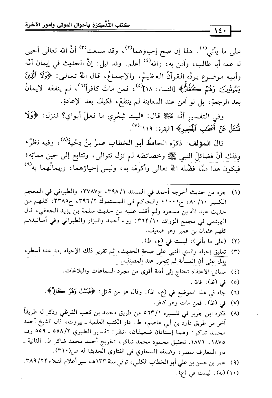 وقد قيل: إن الحديث في إيمان أمه وأبيه موضوع يرده القرآن العظيم والإجماع قال الله العظيم {ولا الذين يموتون وهم كفار} فمن مات كافراً لم ينفعه الإيمان بعد الرجعة، بل لو آمن عند المعاينة لم ينتفع فكيف بعد الإعادة؟ وفي التفسير أنه عليه السلام قال: ليت شعري ما فعل أبواي فنزل {ولا تسأل عن أصحاب الجحيم} .