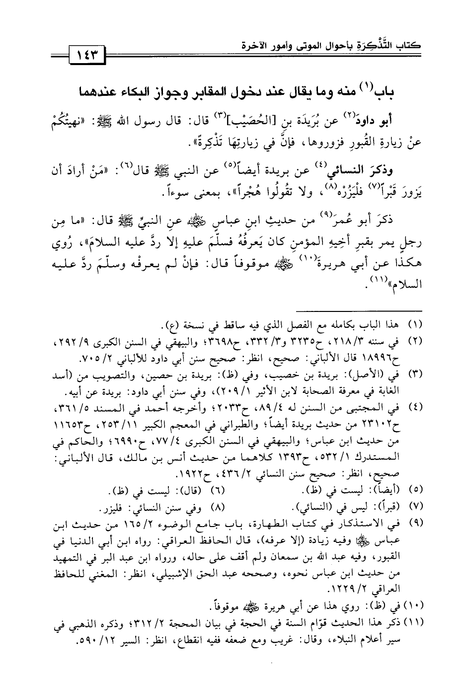 فإن في زيارتها تذكرة» ، وذكر النسائي «عن بريدة أيضاً عن النبي صلى الله عليه وسلم قال: من أراد أن يزور قبراً فليزره، ولا تقولوا هجراً» بمعنى سوءاً، وذكر أبو عمر «من حديث ابن عباس عن النبي صلى الله عليه وسلم قال: ما من رجل يمر بقبر أخيه المؤمن كان يعرفه فسلم عليه، إلا رد عليه السلام» روي هكذا موقوفاً عن أبي هريرة رضي الله عنه قال: «فإن لم يعرفه وسلم: رد عليه السلام» .