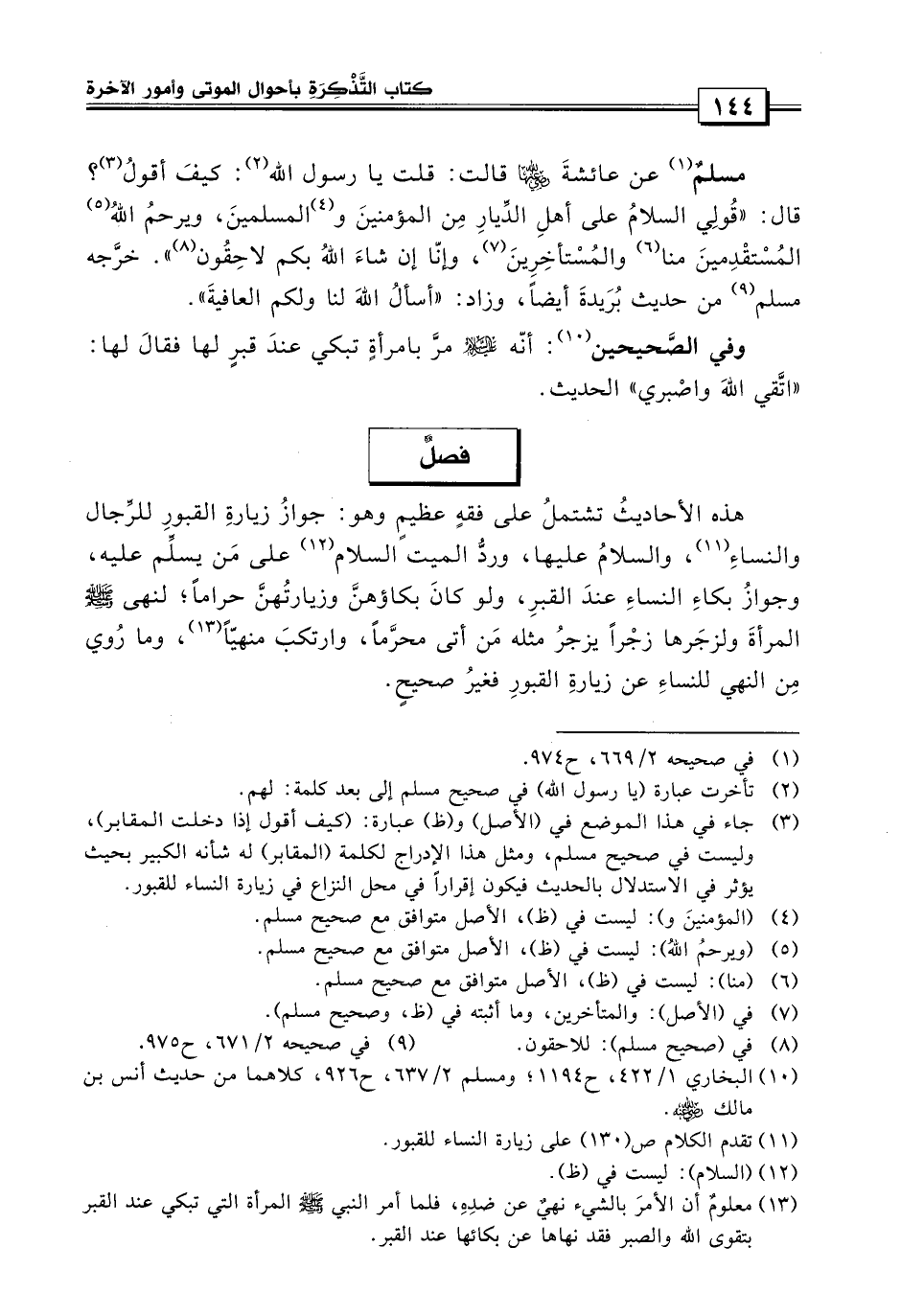 فصل: هذه الأحاديث تشتمل على فقه عظيم وهو جواز زيارة القبور للرجال والنساء والسلام عليها وورد الميت السلام على من يسلم عليه وجواز بكاء النساء عند القبر، ولو كان بكاؤهن وزيارتهن حراماً لنهى النبي صلى الله عليه وسلم المرأة ولزجرها زجراً يزجر مثله من أتى محرماً وارتكب منهياً.