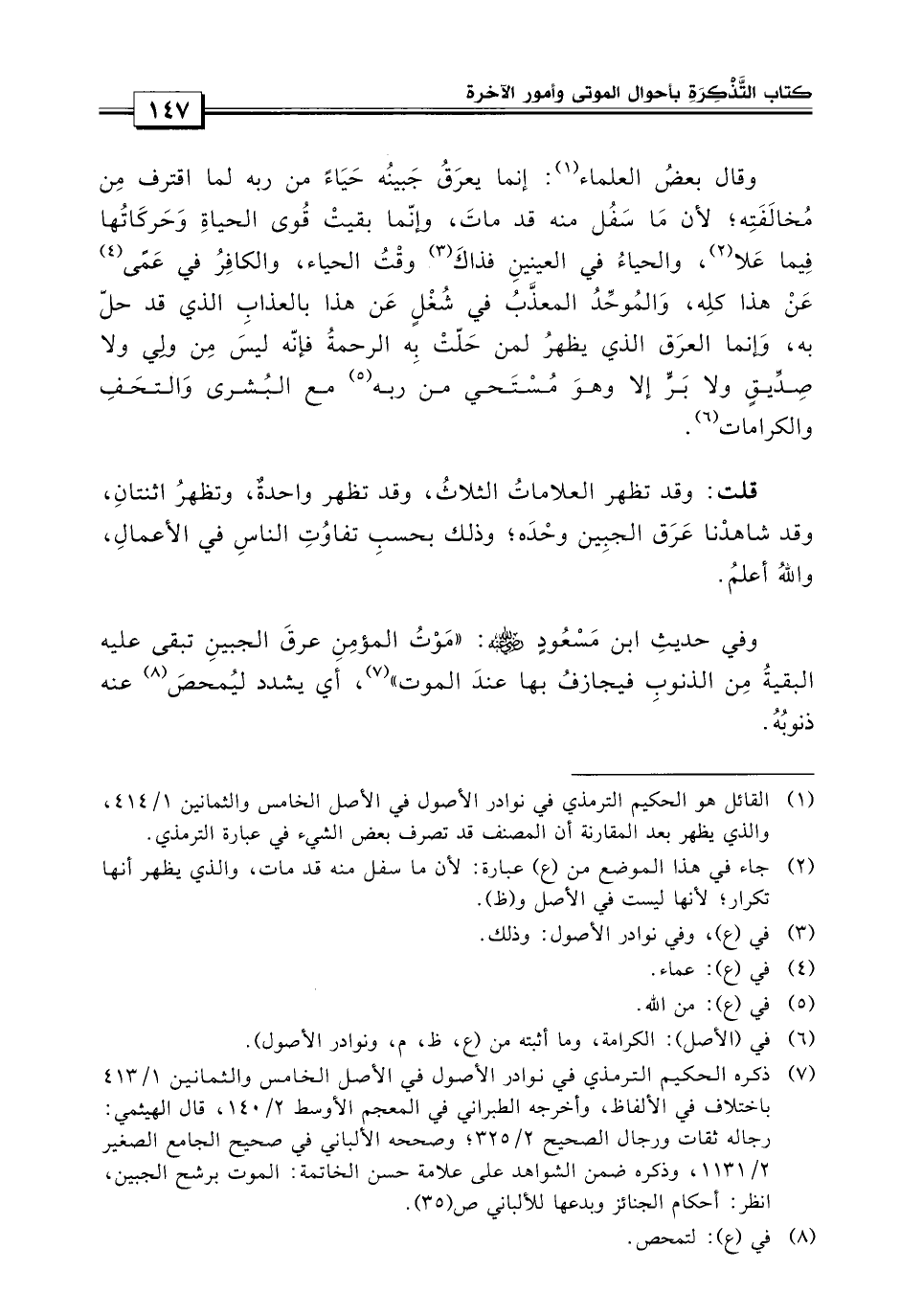 قلت: وقد تظهر العلامات الثلاث، وقد تظهر واحدة وتظهر اثنتان، وقد شاهدنا عرق الجبين وحده.