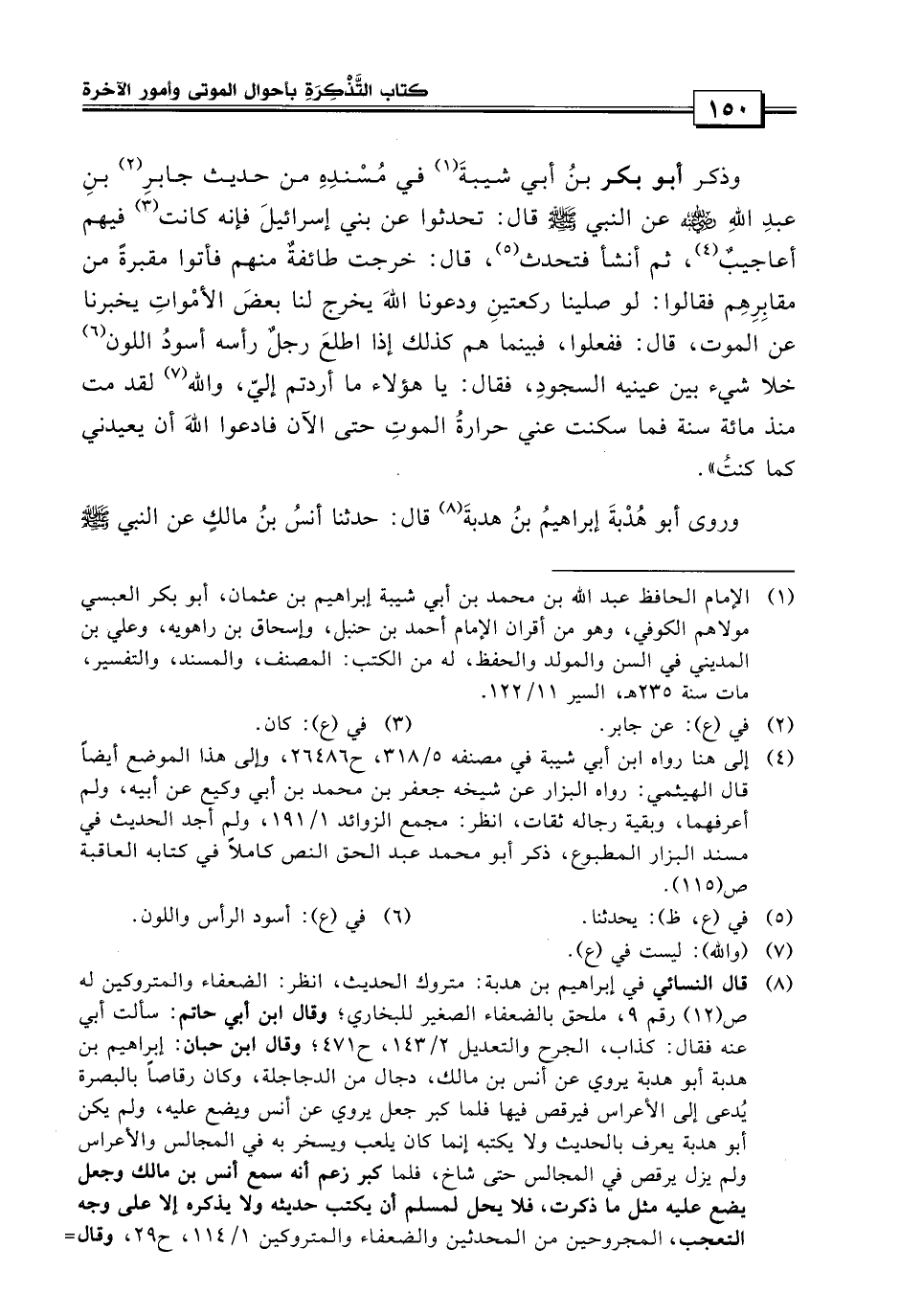 ثم أنشأ يحدثنا قال: [خرجت طائفة منهم فأتوا على مقبرة من مقابرهم فقالوا لو صلينا ركعتين ودعونا الله يخرج لنا بعض الأموات يخبرنا عن الموت قال: ففعلوا.
