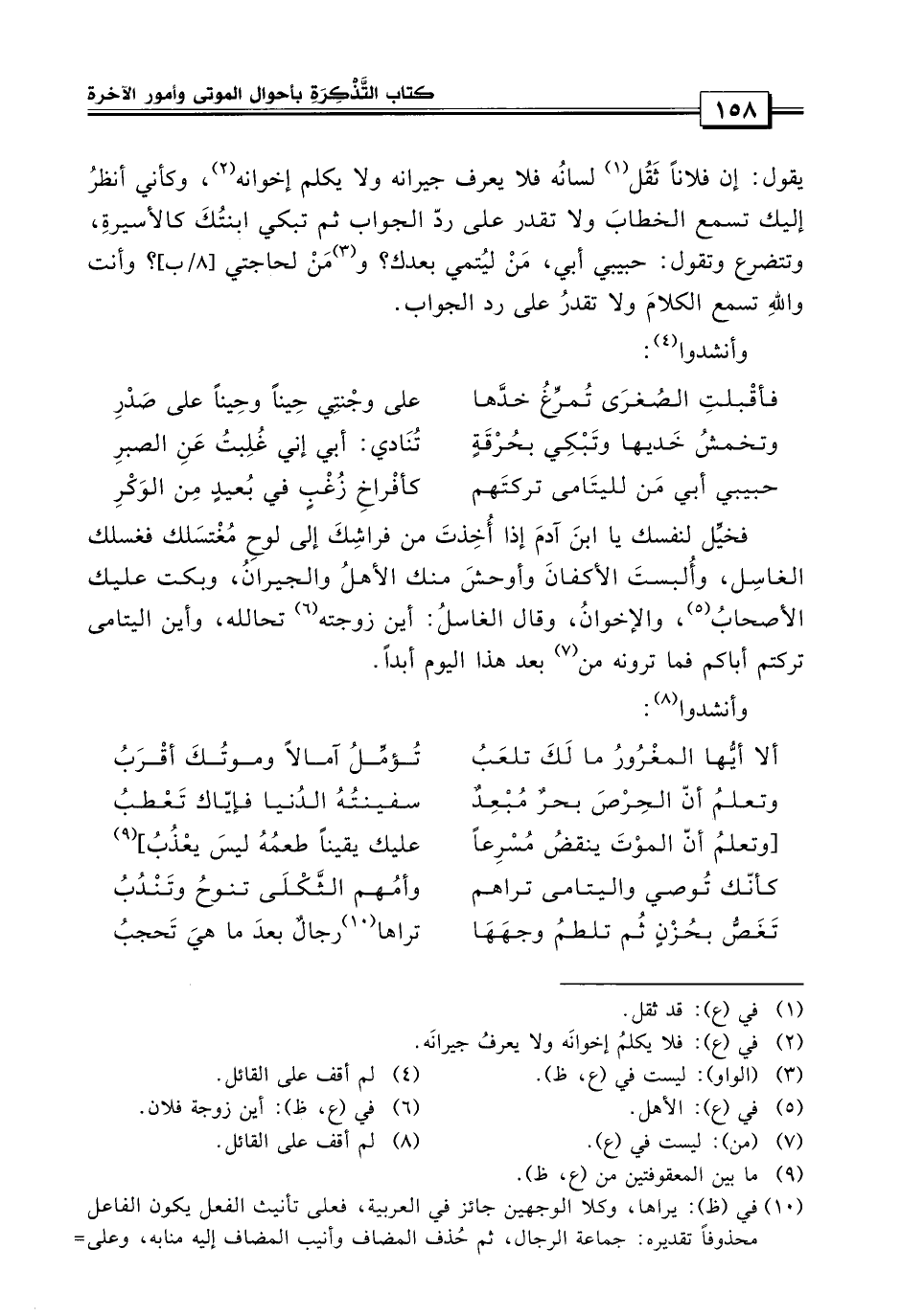 يقول: إن فلاناً ثقل لسانه، فلا يعرف جيرانه، ولا يكلم إخوانه، فكأني أنظر إليك تسمع الخطاب، ولا تقدر على رد الجواب، ثم تبكي ابنتك وهي كالأسيرة، وتتضرع وتقول: حبيبي أبي من ليتمي من بعدك؟ ومن لحاجتي؟ وأنت والله تسمع الكلام ولا تقدر على رد الجواب وأنشدوا:
