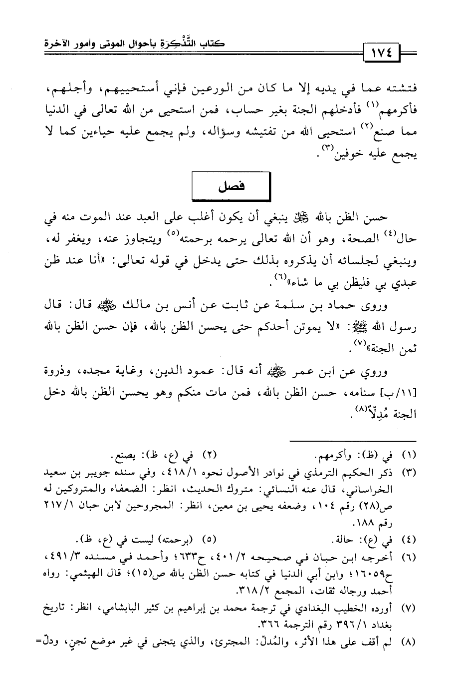 فصل: حسن الظن بالله تعالى، ينبغي أن يكون أغلب على العبد عند الموت منه في حال الصحة، وهو أن الله تعالى يرحمه ويتجاوز عنه ويغفر له وينبغي لجلسائه أن يذكروه بذلك حتى يدخل في قوله تعالى: «أنا عند ظن عبدي بي فليظن بي ما شاء» .