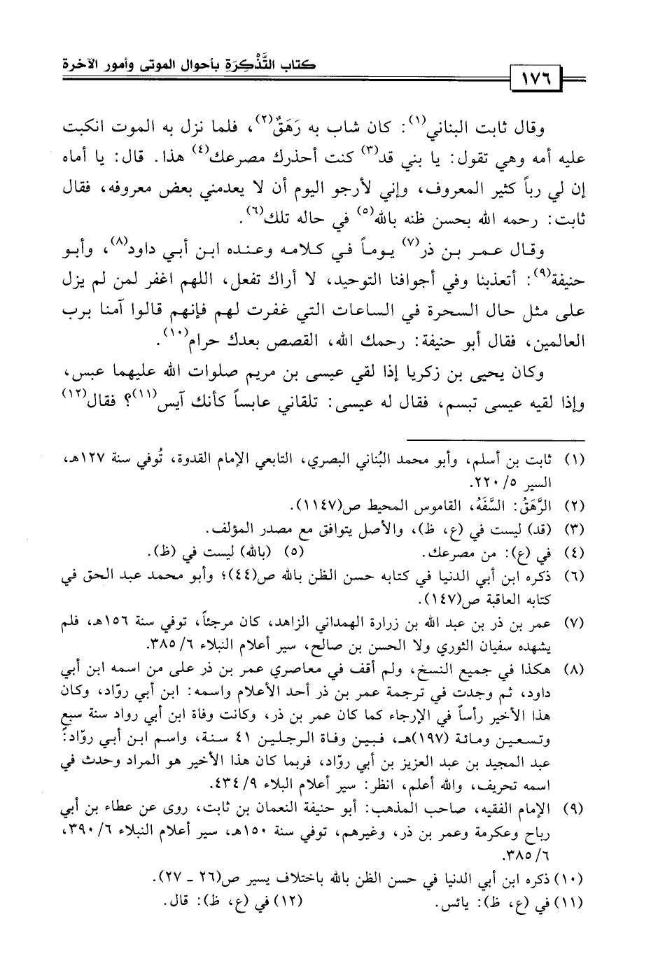وقال ثابت البناني: كان شاب به رهق فلما نزل به الموت انكبت عليه أمه وهي تقول: يا بني قد كنت أحذرك مصرعك هذا، قال: يا أماه إن لي رباً كثير المعروف، وإني لأرجو اليوم أن لا يعدمني بعض معروفه، فقال ثابت: فرحمه الله يحسن ظنه بالله في حاله تلك.