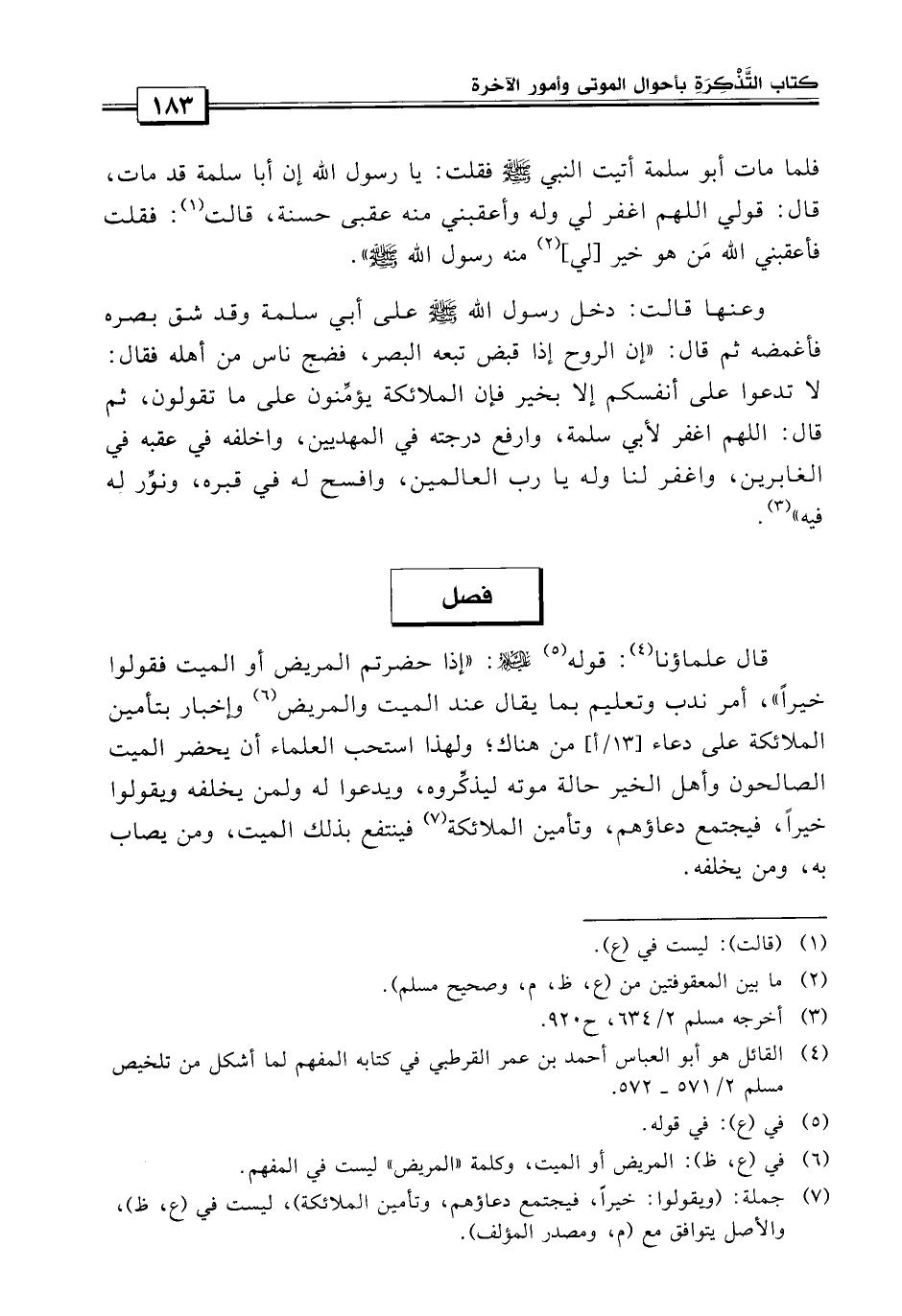 وعنها قالت: «دخل رسول الله صلى الله عليه وسلم على أبي سلمة وقد شق بصره فأغمضه ثم قال: إن الروح إذا قبض تبعه البصر فضج ناس من أهله، فقال: لا تدعوا على أنفسكم إلا بخير فإن الملائكة يؤمنون على ما تقولون ثم قال: اللهم اغفر لأبي سلمة وارفع درجته في المهديين، واخلفه في عقبه في الغابرين، واغفر لنا وله يا رب العالمين، وافسح له في قبره، ونور له فيه» .