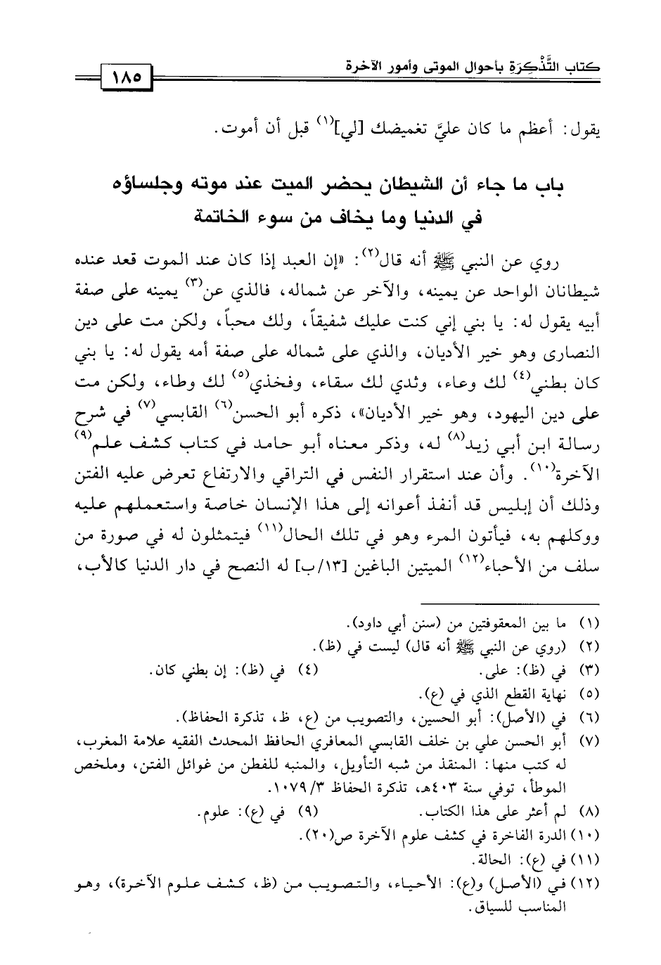 «روي عن النبي صلى الله عليه وسلم أن العبد إذا كان عند الموت قعد عنده شيطانان الواحد عن يمينه والآخر عن شماله، فالذي عن يمينه على صفة أبيه، يقول له: يا بني إني كنت عليك شفيقاً ولك محباً، ولكن مت على دين النصارى فهو خير الأديان، والذي على شماله على صفة أمه، تقول له: يا بني إنه كان بطني لك وعاء، وثديي لك سقاء، وفخذي لك وطاء، ولكن مت على دين اليهود وهو خير الأديان» ، ذكره أبو الحسن القابسي في شرح رسالة ابن أبي زيد له، وذكر معناه أبو حامد في كتاب كشف علوم الآخرة، وإن عند استقرار النفس في التراقي والارتفاع تعرض عليه الفتن وذلك أن إبليس قد أنفذ أعوانه إلى هذا الإنسان خاصة واستعملهم عليه ووكلهم به، فيأتون المرء وهو على تلك الحال فيتمثلون له في صورة من سلف من الأحباب الميتين الباغين له النصح في دار الدنيا، كالأب