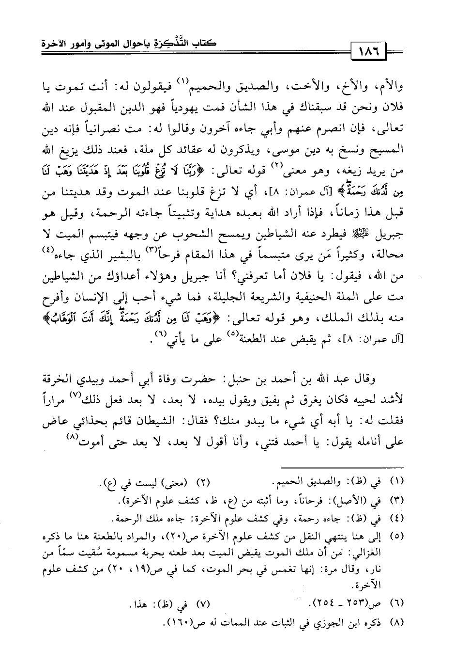 والأم والأخ والأخت والصديق الحميم، فيقولون له: أنت تموت يا فلان ونحن قد سبقناك في هذا الشأن فمت يهودياً فهو الدين المقبول عند الله تعالى، فإن انصرم عنهم وأبي، جاءه آخرون وقالوا له: مت نصرانياً فإنه دين المسيح وقد نسخ الله به دين موسى ويذكرون له عقائد كل ملة، فعند ذلك يزيغ الله من يريد زيغه وهو معنى قوله تعالى: {ربنا لا تزغ قلوبنا بعد إذ هديتنا وهب لنا من لدنك رحمة} أي لا تزغ قلوبنا عند الموت وقد هديتنا من قبل هذا زماناً، فإذا أراد الله بعبده هداية وتثبيتاً جاءته الرحمة، وقيل: هو جبريل عليه السلام فيطرد عنه الشياطين ويمسح الشحوب عن وجهه فيبتسم الميت لا محالة، وكثير من يرى متبسماً في هذا المقام فرحاً بالبشير الذي جاءه من الله تعالى فيقول: يا فلان أما تعرفني؟ أنا جبريل وهؤلاء أعداؤك من الشياطين مت على الملة الحنيفية والشريعة الجليلة.