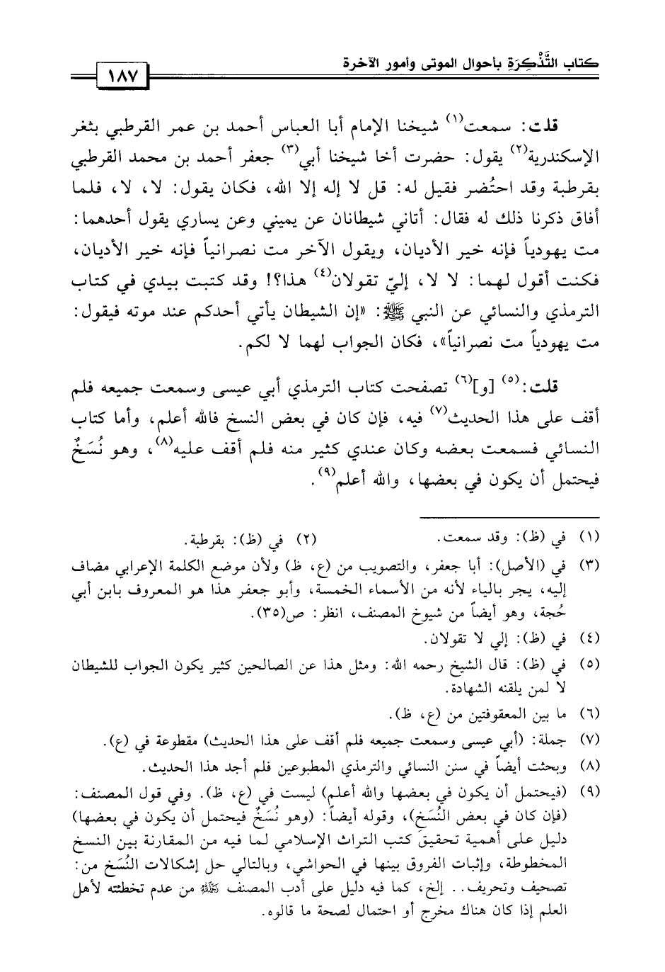 قلت: ومثل هذا عن الصالحين كثير يكون الجواب للشيطان لا لمن يلقنه الشهادة، وقد تصفحت كتاب الترمذي أبي عيسى، وسمعت جميعه، فلم أقف على هذا الحديث فيه، فإن كان في بعض النسخ فالله أعلم.