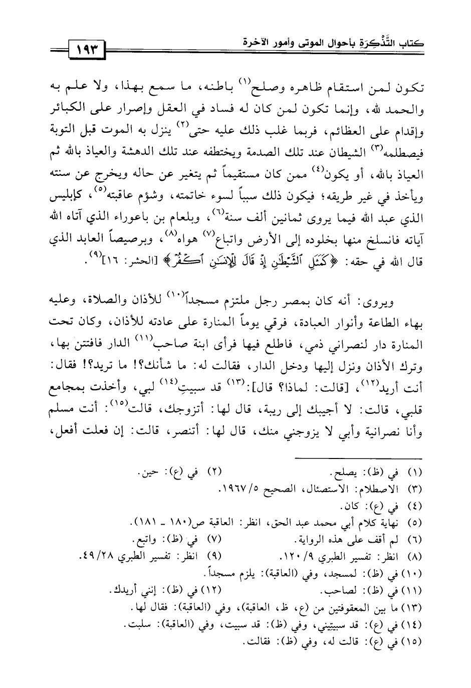 فربما غلب ذلك عليه حتى ينزل به الموت قبل التوبة، فيصطلمه الشيطان عند تلك الصدمة، ويختطفه عند تلك الدهشة، والعياذ بالله، ثم العياذ بالله، أو يكون ممن كان مستقيماً، ثم يتغير عن حاله ويخرج عن سننه، ويأخذ في طريقه، فيكون ذلك سبباً لسوء خاتمه وشؤم عاقبته، كإبليس الذي عبد الله فيما يروى ثمانين ألف سنة، وبلعام بن باعوراء الذي آتاه الله آياته فانسلخ منها بخلوده إلى الأرض، واتباع هواه، وبرصيصا العابد الذي قال الله في حقه {كمثل الشيطان إذ قال للإنسان اكفر} .