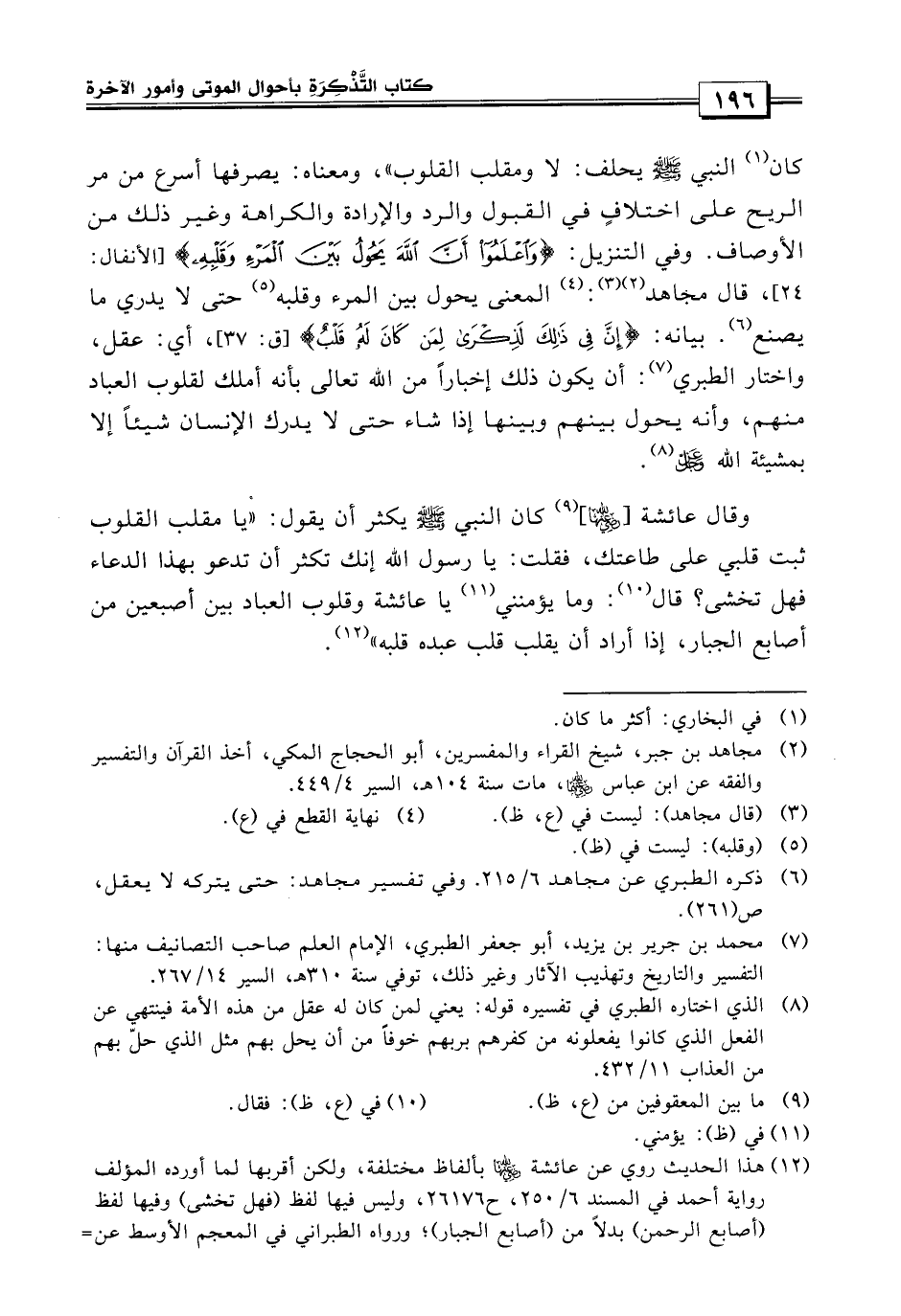 وقالت عائشة رضي الله عنها: «كان النبي صلى الله عليه وسلم يكثر أن يقول يا مقلب القلوب ثبت قلبي على طاعتك فقلت: يا رسول الله إنك تكثر أن تدعو بهذا الدعاء فهل تخشى؟ قال: وما يؤمنني يا عائشة وقلوب العباد بين أصبعين من أصابع الجبار إذا أراد أن يقلب قلب عبده قلب» .
