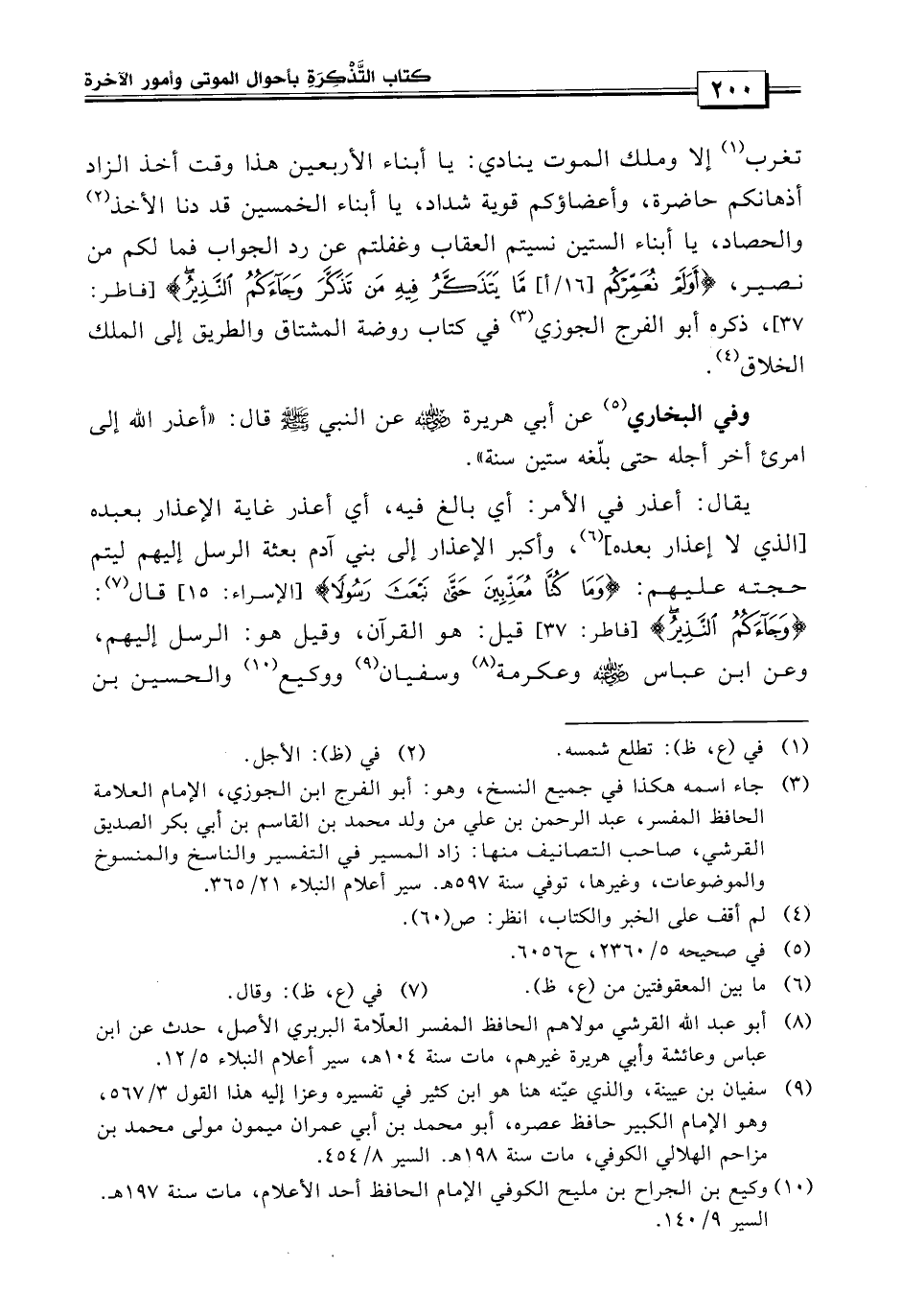 وفي البخاري، «عن أبي هريرة رضي الله عنه عن النبي قال: أعذر الله إلى امرىء أخر أجله حتى بلغ ستين سنة» يقال أعذر في الأمر أي بالغ فيه أي اعذر غاية الإعذار بعبده وأكبر الأعذار إلى بني آدم بعثة الرسل إليهم ليتم حجته عليهم {وما كنا معذبين حتى نبعث رسولاً} وقال {وجاءكم النذير} قيل: هو القرآن.