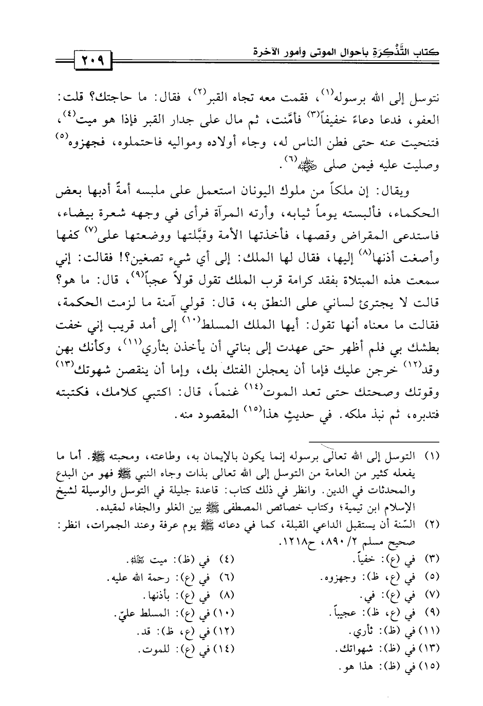 قالت ما معناه أنها تقول: أيها الملك المسلط إلى أمد قريب إني خفت بطشك بي فلم أظهر حتى عهدت إلى بناتي أن يأخذن بثأري، وكأنك بهن قد خرجن عليك فإما أن يعجلن إلفتك بك وإما أن بنقصن شهوتك وقوتك وصحتك حتى تعد الموت غنماً فقال: اكتبي كلامك فكتبته فتدبره، ثم نبذ ملكه في حديث، وهذا المقصود منه