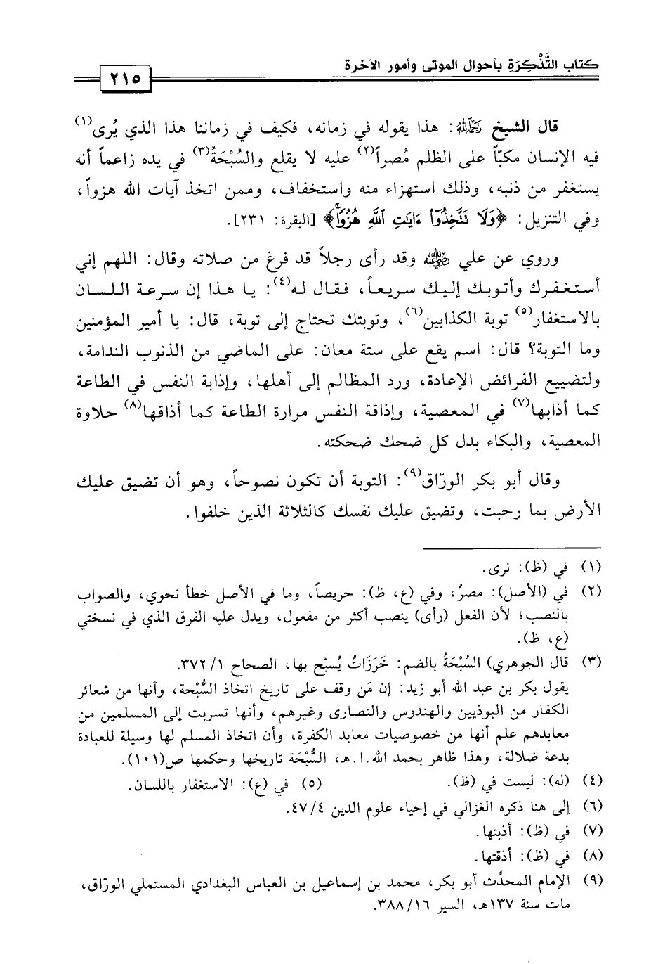 قال الشيخ المؤلف رحمه الله: هذا مقوله في زمانه فكيف في زماننا هذا الذي يرى فيه الإنسان مكباً على الظلم حريصاً عليه لا يقلع والبحة في يده زاعماً أنه يستغفر من ذنبه وذلك استهزاء منه واستخفاف.