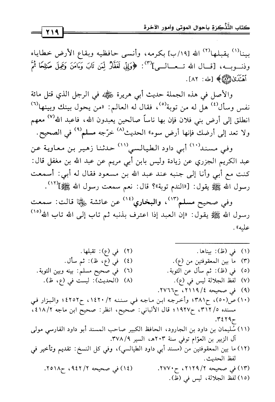 الحديث أخرجه مسلم في الصحيح وفي مسند أبي داود الطيالسي: «حدثنا زهير بن معاوية، عن عبد الكريم الجزري، عن زياد وليس بابن أبي مريم، عن عبد الله بن مغفل قال: كنت مع أبي وأنا إلى جنبه عند عبد الله بن مسعود فقال له أبي: أسمعت رسول الله صلى الله عليه وسلم يقول: أن العبد إذا اعترف بذنبه ثم تاب إلى الله عز وجل تاب الله عليه؟ فقال: نعم سمعته يقول: الندم توبة» .
