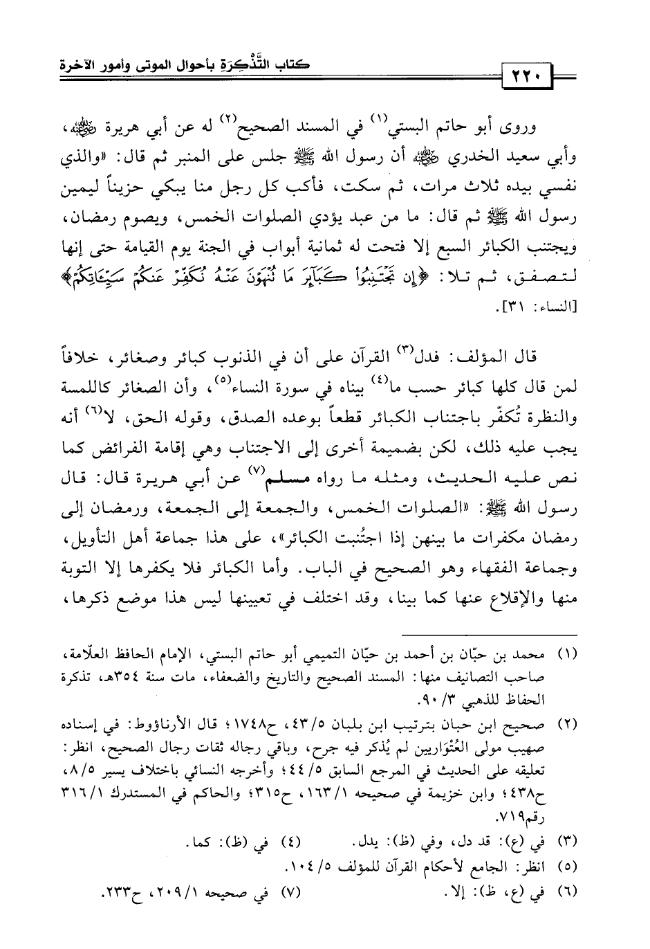 وروى أبو حاتم البستي في المسند الصحيح له «عن أبي هريرة رضي الله عنه وأبي سعيد الخدري أن رسول الله صلى الله عليه وسلم جلس على المنبر ثم قال: والذي نفسي بيده ثلاث مرات ثم سكت فأكب كل رجل منا يبكي حزيناً ليمين رسول الله صلى الله عليه وسلم ثم قال: ما من عبد يؤدي الصلوات الخمس ويصوم رمضان ويجتنب الكبائر السبع إلا فتحت له أبواب الجنة الثمانية يوم القيامة حتى أنها لتصفق.
