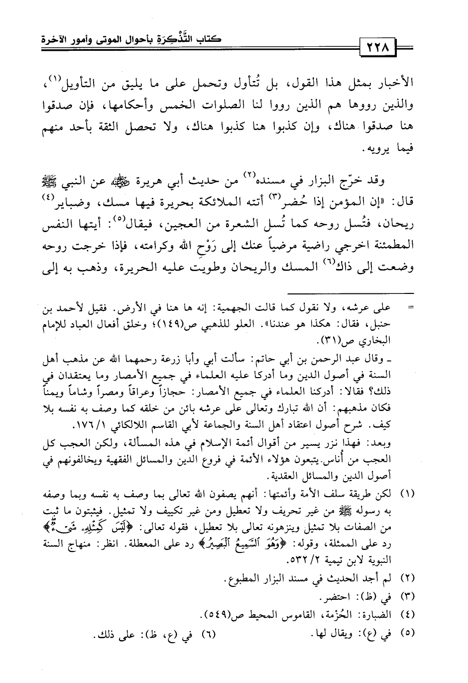 وقد خرج البزار في مسنده «من حديث أبي هريرة رضي الله عنه عن النبي صلى الله عليه وسلم قال: إن المؤمن إذا احتضر أتته الملائكة بحريرة فيها مسك وضبائر ريحان فتسل روحه كما تسل الشعرة من العجين ويقال: {يا أيتها النفس المطمئنة * ارجعي إلى ربك راضية} مرضياً عنك إلى روح الله وكرامته، فإذا خرجت روحه وضعت على ذلك المسك والريحان وطيت عليها الحريرة وذهب بها إلى