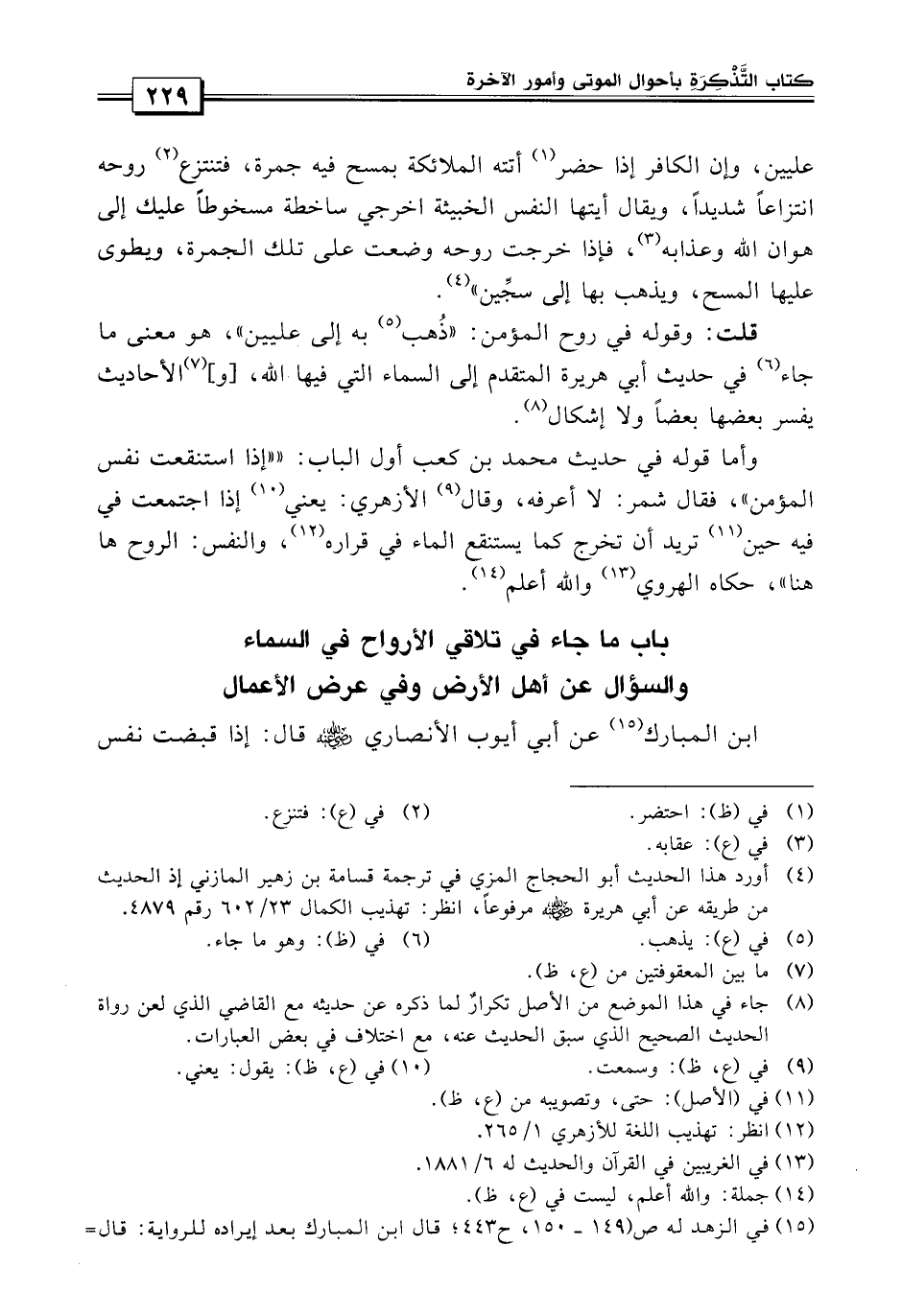 قال الشيخ المؤلف رحمه الله: فقوله في روح المؤمن: يذهب بها إلى عليين هو معنى ما جاء في حديث أبي هريرة المتقدم إلى السماء التي فيها الله.