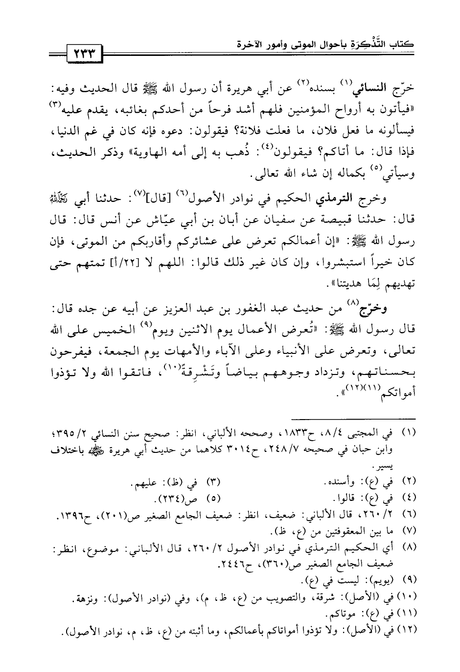 وخرج الترمذي الحكيم في نوادر الأصول قال: «حدثنا أبي رحمه الله قال: حدثنا قبيصة، عن سفيان، عن أبان بن أبي عياش، عن أنس قال: قال رسول الله صلى الله عليه وسلم: إن أعمالكم تعرض على عشائركم وأقاربكم من الموتى فإن كان خيراً استبشروا وإن كان غير ذلك قالوا: اللهم لا تمتهم حتى تهديهم لما هديتنا» .