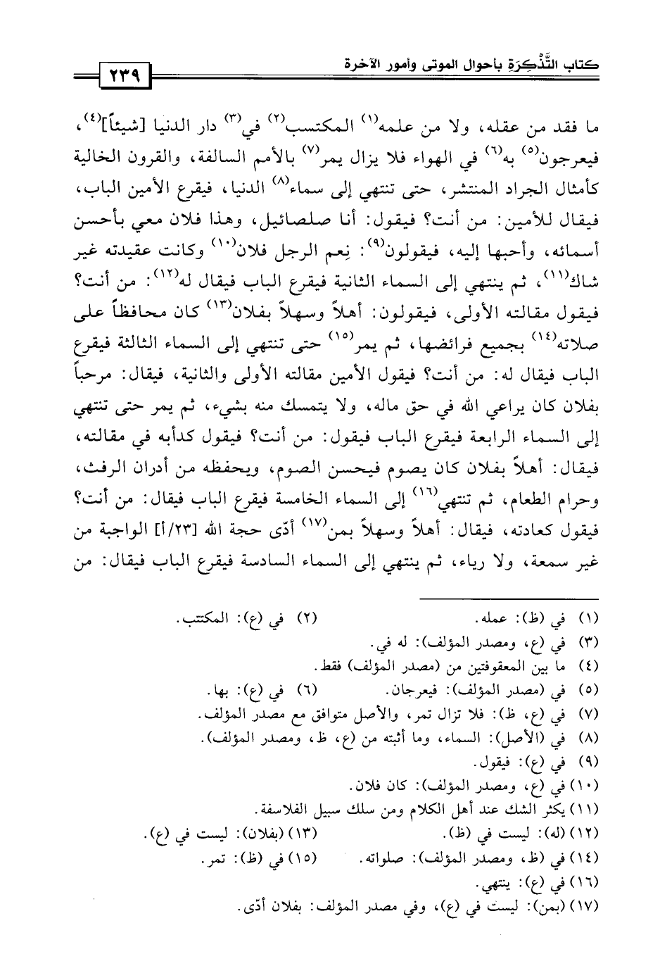ما فقد من عقله ولا من علمه المكتسب له في دار الدنيا، فيعرجون بها في الهواء، فلا يزال يمر بالأمم السالفة والقرون الخالية كأمثال الجراد المنتشر، حتى ينتهي إلى سماء الدنيا، فيقرع الأمين الباب فيقال للأمين: من أنت؟ فيقول: أنا صلصائيل، وهذا فلان معي بأحسن أسمائه وأحبها إليه فيقول: نعم الرجل كان فلان، وكانت عقيدته غير شاك.