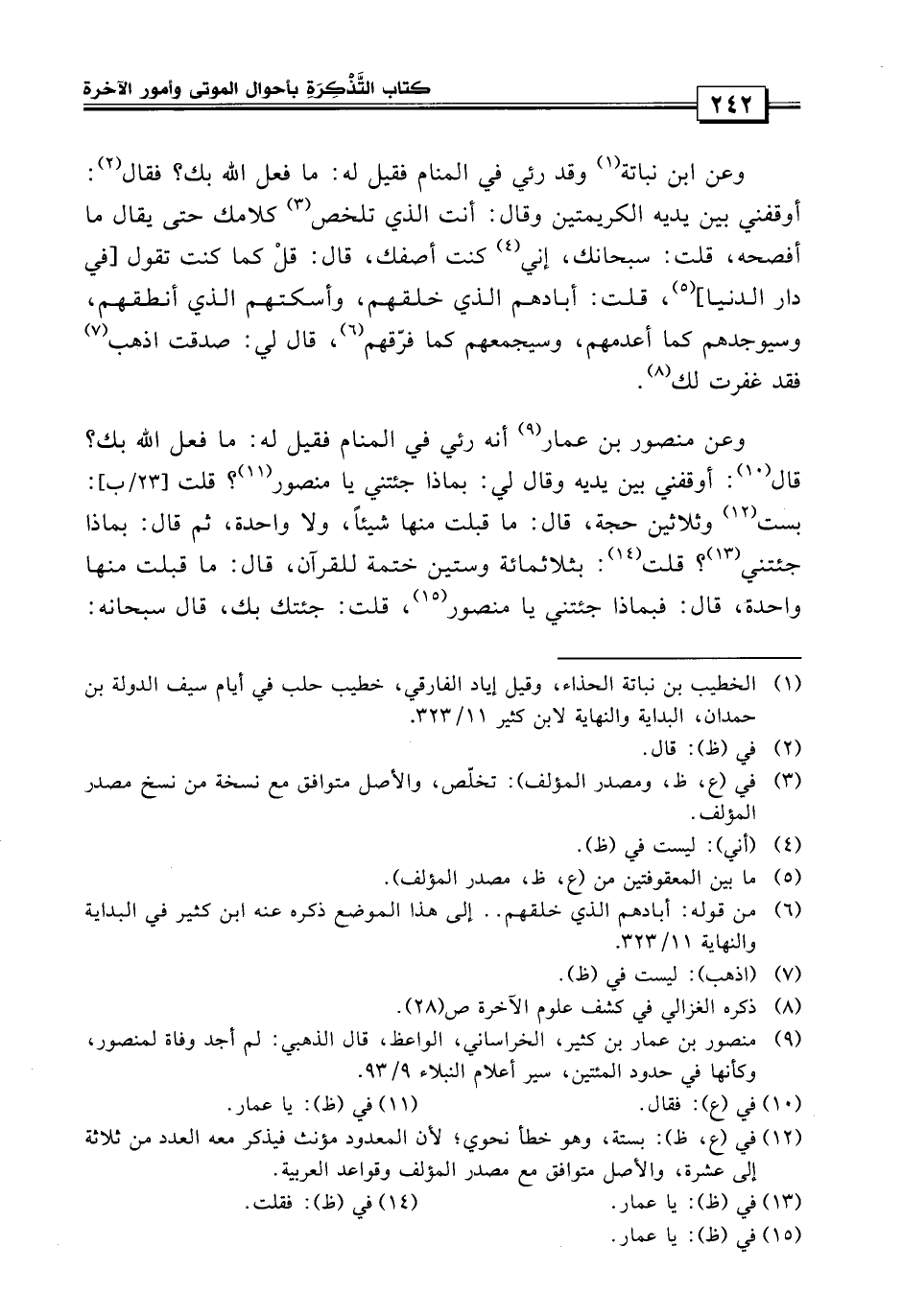 وعن ابن نباتة وقد رئي في المنام فقيل له: ما فعل الله بك؟ فقال: أوقفني بين الكريمين وقال: أنت الذي تخلص كلامك حتى يقال: ما أفصحه! فقلت: سبحانك إني أصفك: قال: قل ما كنت تقول في دار الدنيا، قلت: أبادهم الذي خلقهم، وأسكنهم الذي أنطقهم وسيوجدهم كما أعدمهم، وسيجمعهم كما فرقهم.
