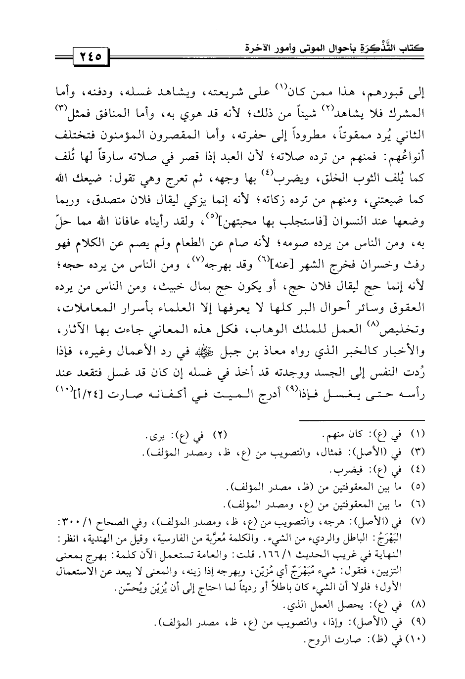 ثم تعرح وتقول: ضيعك الله كما ضيعتني، ومنهم من ترده زكاته لأنه إنما يزكي ليقال: فلان متصدق، وربما وضعها عند النساء، ولقد رأيناه عافانا الله مما حل به، ومن الناس من يرده صومه، لأنه صام عن الطعام ولم يصم عن الكلام فهو رفث وخسران فيخرج الشهر وقد بهرجه، ومن الناس من يرده حجه، لأنه إنما حج ليقال فلان حج، أو يكون حج بمال خبيث، ومن الناس من يرده العقوق، وسائر أحوال البر كلها، لا يعرفها إلا العلماء بأسرار المعاملات، وتخليص العمل الذي للملك الوهاب، فكل هذه المعاني جاءت بها الآثار والأخبار، كالخبر الذي رواه معاذ بن جبل رضي الله عنه في رد الأعمال وغيره، فإذا ردت النفس إلى الجسد ووجدته قد أخذ في غسله إن كان قد غسل فتقعد عند رأسه حتى يغسل، فإذا أدرج الميت في أكفانه صارت