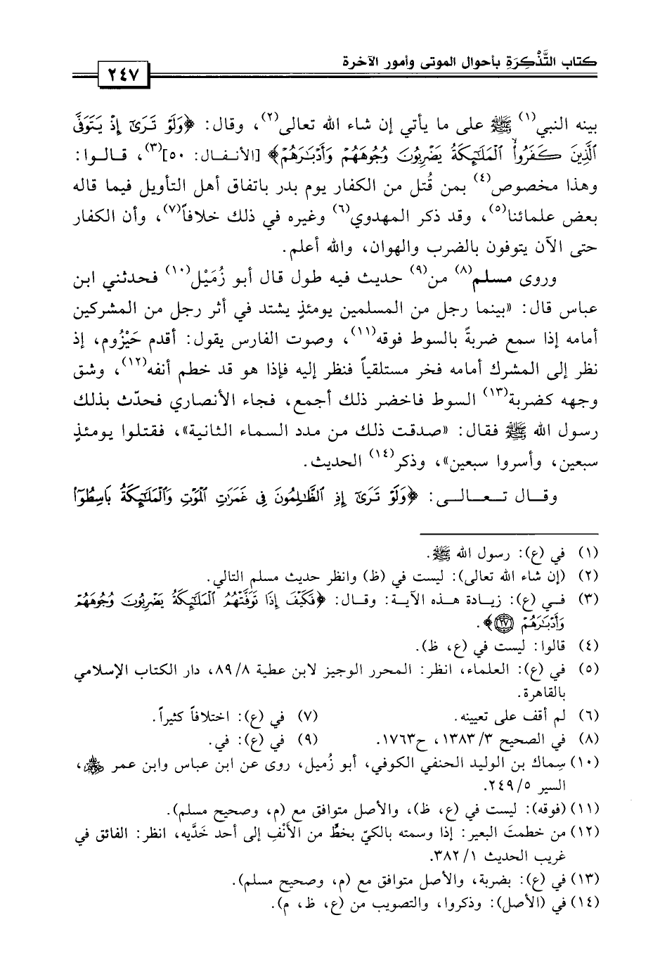 بينه رسول الله صلى الله عليه وسلم على ما يأتي بيانه إن شاء تعالى، وقال: {ولو ترى إذ يتوفى الذين كفروا الملائكة يضربون وجوههم وأدبارهم} ، وقال: {فكيف إذا توفتهم الملائكة يضربون وجوههم وأدبارهم} ، وهذا مخصوص بمن قتل من الكفار يوم بدر باتفاق أهل التأويل، فيما قاله بعض علمائنا، وقد ذكر المهدوي وغيره في ذلك اختلافاً، وأن الكفار حتى الآن يتوفون بالضرب والهوان والله أعلم.