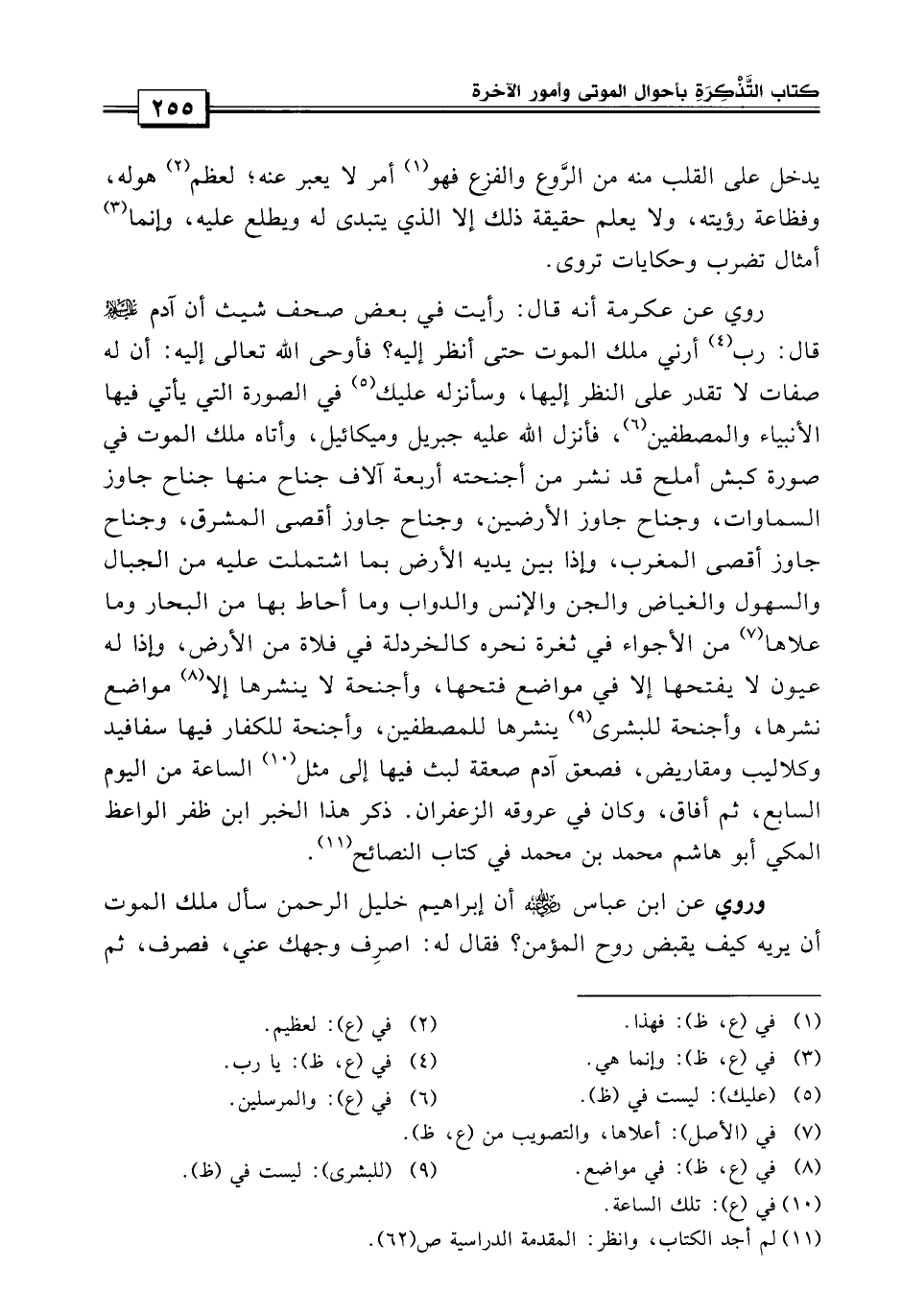 روى عن عكرمة أنه قال: رأيت في بعض صحف شيث أن آدم عليه السلام قال: يا رب أرني ملك الموت حتى أنظر إليه، فأوحى الله تعالى إليه: إن له صفات لا تقدر على النظر إليها وسأنزله عليك في الصورة التي يأتي فيها الأنبياء والمصطفين، فأنزل الله عليه جبريل وميكائيل وأتاه ملك الموت في صورة كبش أملح قد نشر من أجنحته أربعة آلاف جناح، منها جناح جاوز السموات والأرض، وجناح جاوز الأرضين، وجناح جاوز أقصى المشرق، وجناح جاوز أقصى المغرب، وإذا بين يديه الأرض بما اشتملت عليه من الجبال والسهول والغياض والجن والإنس والدواب وما أحاط بها من البحار وما علاها من الأجواء في ثغرة نحرة كالخردلة في فلاة من الأرض، وإذا عيون لا يفتحها إلا في مواضع فتحها، وأجنحة لا ينشرها إلا في مواضع نشرها، وأجنحة للبشرى ينشرها للمصطفين، وأجنحة للكفار فيها سفافيد وكلاليب ومقاريض، فصعق آدم صعقة لبث فيها إلى مثل تلك الساعة من اليوم السابع، ثم أفاق وكان في عروفة الزعفران.