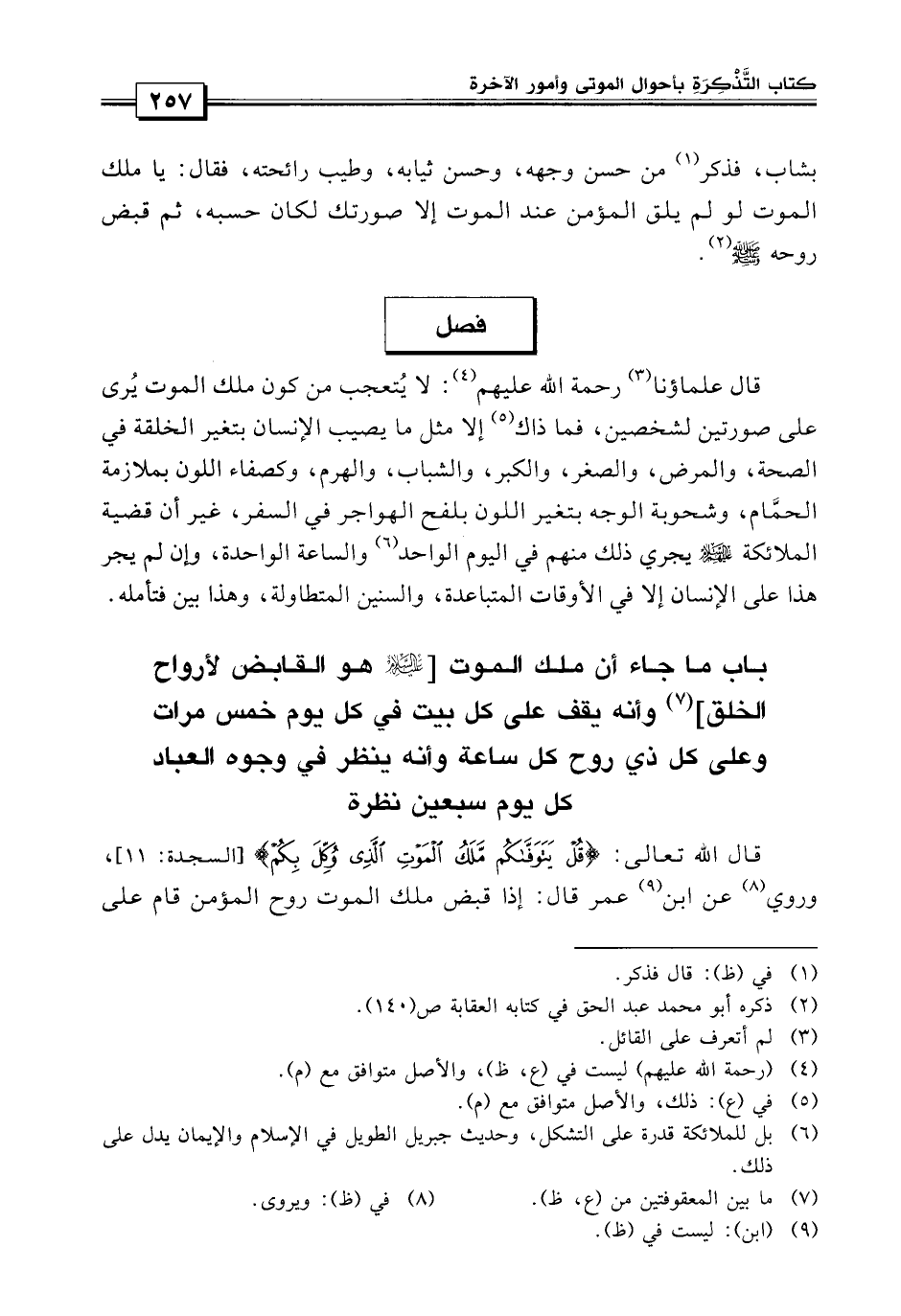 باب ما جاء أن ملك الموت عليه السلام هو القابض لأرواح الخلق وأنه يقف على كل بيت في كل يوم خميس مرات وعلى كل ذي روح كل ساعة وأنه ينظر في وجوه العباد كل يوم سبعين نظرة