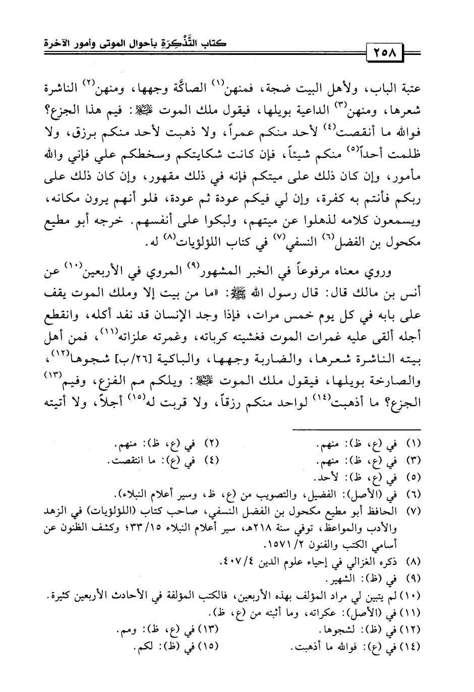 وروى معناه مرفوعاً في الخبر المشهور المروي في الأربعين «عن أنس بن مالك قال: قال رسول الله صلى الله عليه وسلم: ما من بيت إلا وملك الموت يقف على بابه في كل يوم خمس مرات، فإذا وجد الإنسان قد نفذ أكله وانقطع أجله ألقى عليه غمرات الموت، فغشيته كرباته وغمرته غمراته، فمن أهل بيته الناشرة شعرها والضاربة وجهها والباكية لشجوها والصارخة بويلها، فيقول ملك الموت عليه السلام: ويلكم مم الفزع ومم الجزع؟ ما أذهبت لأحد منكم رزقاً ولا قربت له أجلاً ولا أتيته