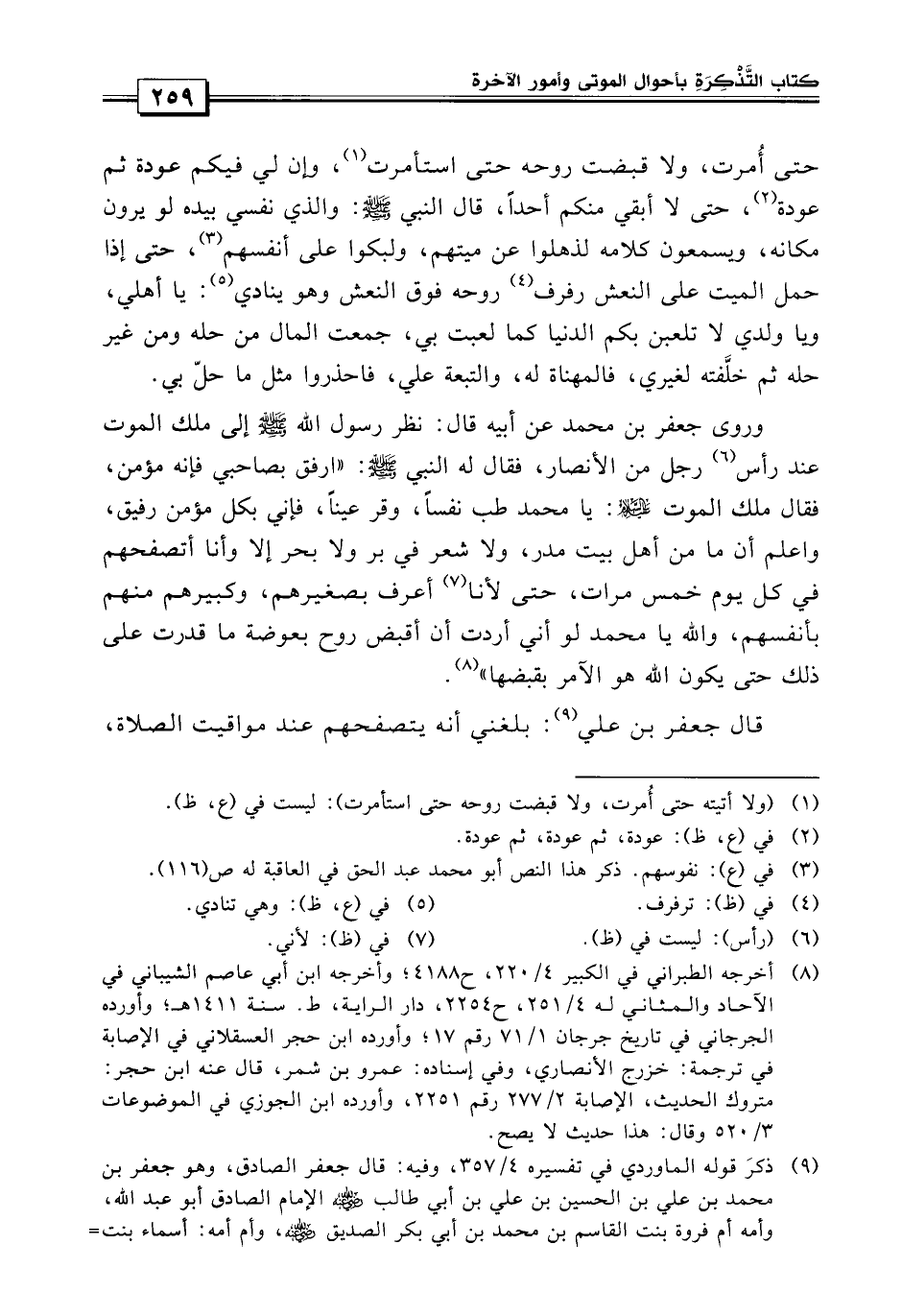 وروى جعفر بن محمد «عن أبيه قال: نظر رسول الله صلى الله عليه وسلم إلى ملك الموت عند رأس رجلاً من الأنصار فقال له النبي صلى الله عليه وسلم: ارفق بصاحبي فإنه مؤمن، فقال ملك الموت: يا محمد طيب نفساً وقر عيناً فإني بكل مؤمن رفيق، واعلم أن ما من أهل بيت مدر ولا شعر في بر ولا بحر، إلا وأنا أتصفحهم في كل يوم خمس مرات حتى لأنا أعرف بصغيرهم وكبيرهم منهم لأنفسهم، والله يا محمد لو أني أردت أن أقبض روح ما قدرت على ذلك حتى يكون الله هو الآمر بقبضها» .