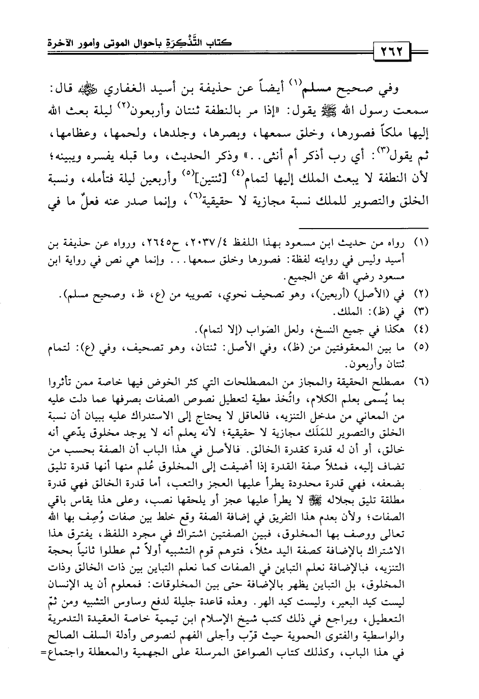 وفي صحيح مسلم أيضاً: «عن حذيفة بن أسيد الغفاري قال: سمعت رسول الله صلى الله عليه وسلم يقول: إذا مر بالنطفة إثنتان وأربعون بعث الله إليها ملكاً فصورها وخلق سمعها وبصرها وشعرها وجلدها ولحمها وعظامها.