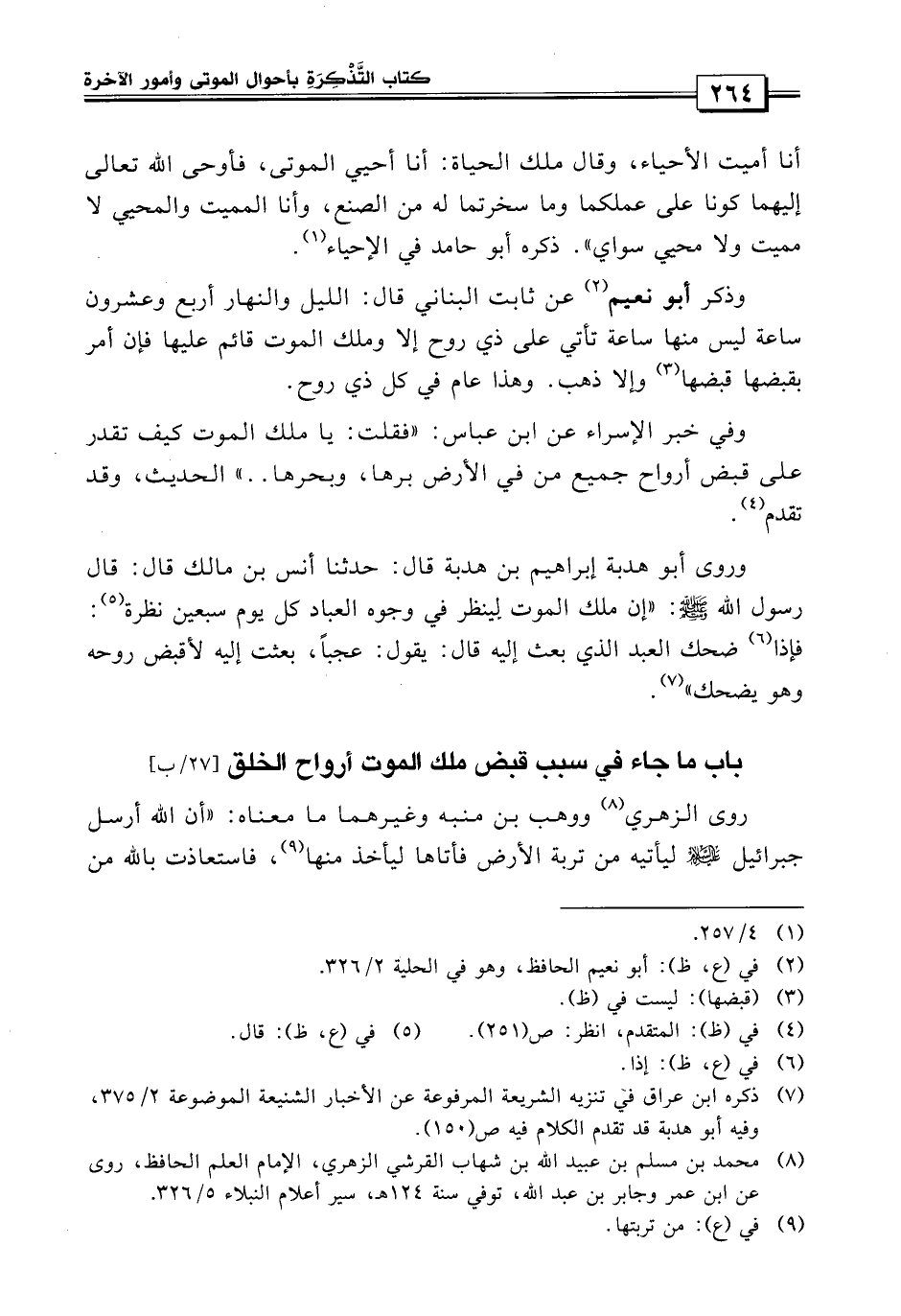 وذكر أبو نعيم الحافظ عن ثابت البناني قال الليل والنهار أربع وعشرون ساعة ليس منه ساعة تأتي على ذي روح إلا ملك الموت قائم عليها، فإن أمر بقبضها قبضها وإلا ذهب، وهذا عام في كل ذي روح.