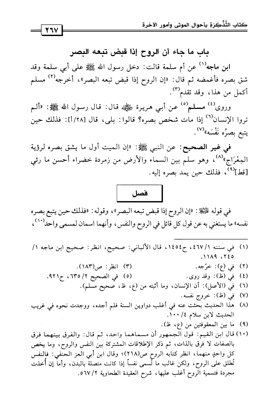وروى مسلم «عن أبي هريرة، قال: قال رسول الله صلى الله عليه وسلم: ألم تروا الإنسان إذا مات شخص بصره، قالوا: بلى، قال: فذلك حين يتبع بصره نفسه» ، وفي غير الصحيح «عن النبي صلى الله عليه وسلم، أن الميت أول ما يشق بصره لرؤية المعراج وهو سلم بين السماء والأرض من زمردة خضراء أحسن ما رئي قط، فذلك حين يمد بصره إليه» .